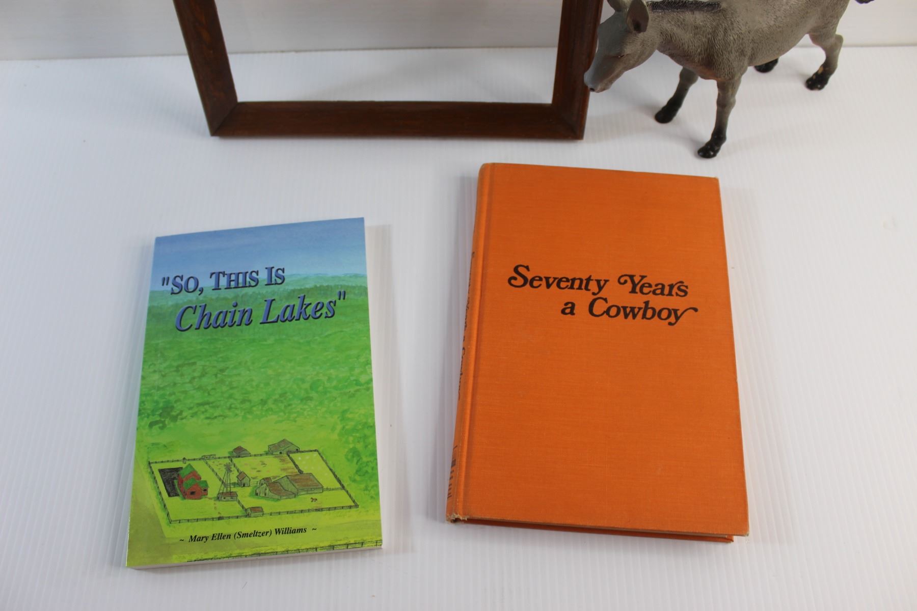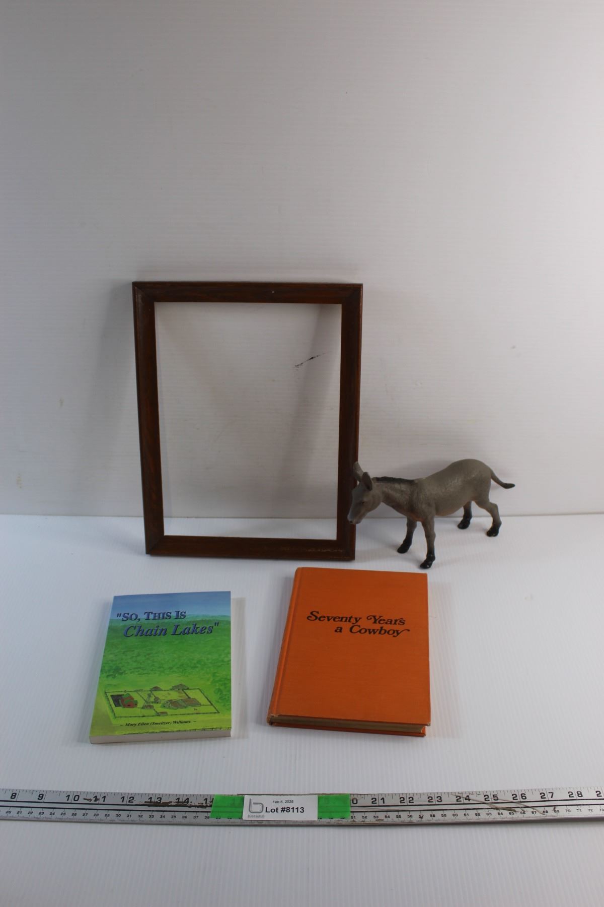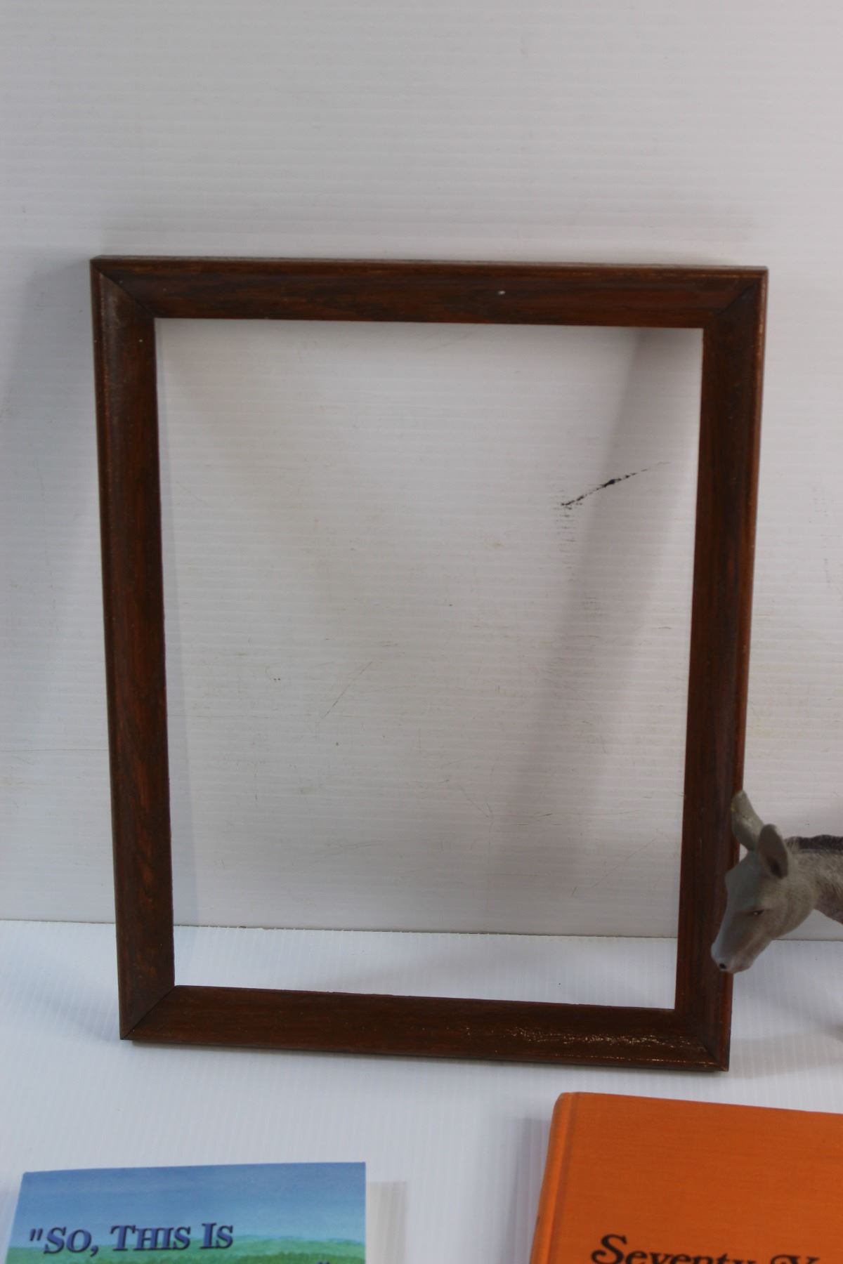 Photo Frame 13 1/2'' x 10 1/2''. Toy Donkey and (2) Books by Mary Ellen and Philip Sheridon Long