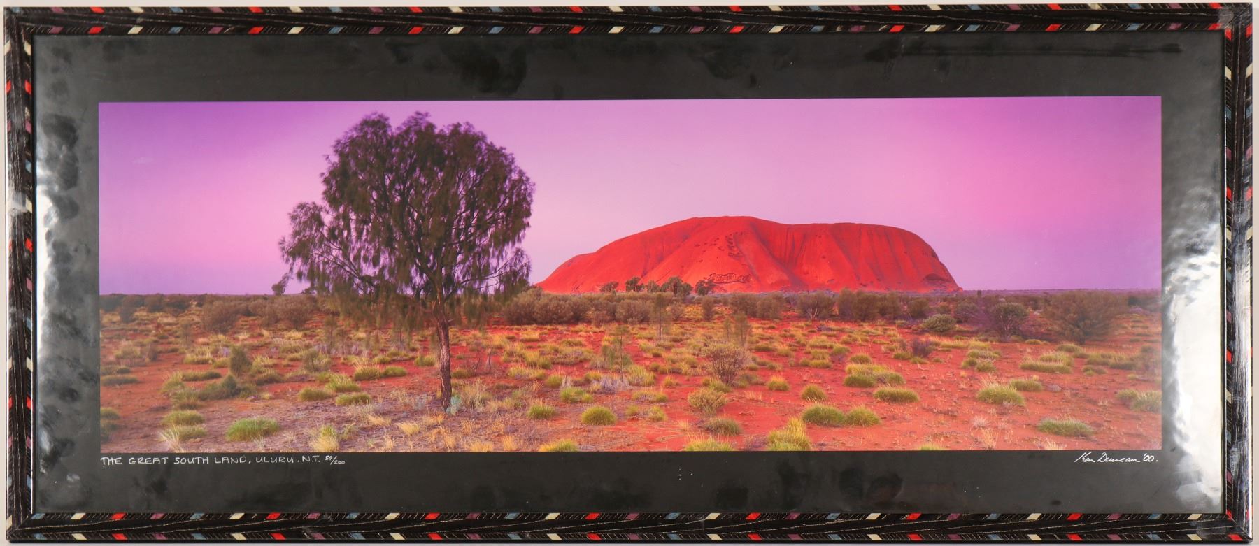 Here is a very beautiful photograph, taken by the famous Ken Duncan. He is a well known pioneer in the Limited Edition Art field, in Australia since the 1980's. It is entitled " The Great South Land Uluru, N.T" and is located in Uluru-Kata National Park. Now a days, the government owns everything in that area. But, according to the original Aboriginal concept called " Tjukurpa".... " We do not own the land; the land owns us ! ". It is 15" tall x 35 1/8" wide, and is # 59/ 200 produced. Perfect condition set in black multi colored diamond type frame, and signed by the artist. Excellent opportunity to get a great piece of art !! ( RH)