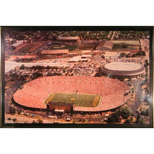 This incredible print of Peter Stanger?s photo taken of the University of Michigan?s Stadium, often referred to as the Big House, is a truly remarkable aerial view. Not only are you getting to see a game in progress with thousands of adoring fans, but the surrounding area as well, which completely demonstrates Michigan?s wonderful athletic tradition. In the upper left hand corner of the picture is Ferry Field, a track and field sports facility; just to the right of that is the well manicured Ray Fisher baseball diamond; and right behind the stadium is the home of the men?s and women?s basketball teams along with women?s gymnastics, Crisler Arena. Of course, the main focus is the Big House, home of Michigan football, with its ebullient players and cheering fans. Michigan Stadium is one of the most recognized sporting facilities in the country; and no wonder, it was even the largest college owned stadium in the nation back in 1927 when it first opened its doors, with a capacity of 84, 401 . Over the years, it has come to represent the pride, tradition, and excellence of the University. This picture was taken in 1984, which back then the stadium only housed 102,501 loyal fans. Since then improvements have been made, as they have been doing since it was first built, so that the stadium now can seat 107, 501 fans. There is definitely no other place like it on a Saturday afternoon in the fall. This piece has been framed in a thin gold metal frame, so as to not detract from the importance ...