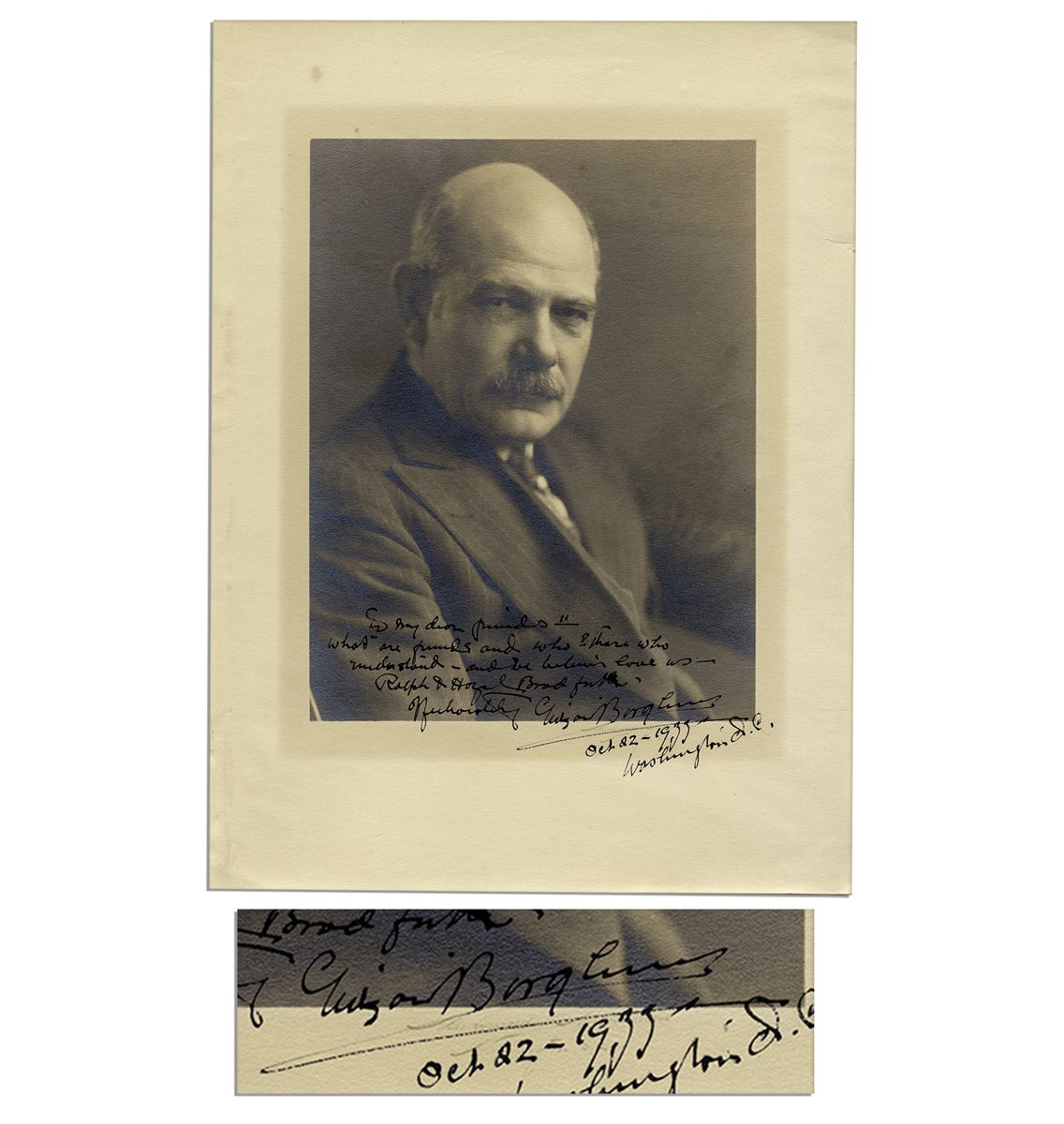 Mt. Rushmore artist Gutzon Borglum large photo portrait signed. Portrait of Borglum is inscribed along the bottom edge of the image, ''To my dear friends / what are friends and who share who / understand and we believe love us - / Ralph & Hazel...Gutzon Borglum / Oct 22-1933 / Washington D.C.'' Matte photo measures 10.5'' x 13.75''. Toning, crease to left corner and pencil notations to verso, else near fine. From the personal collection of the son of the Corpus Christi Chamber of Commerce manager, who participated in commissioning Borglum for another project.