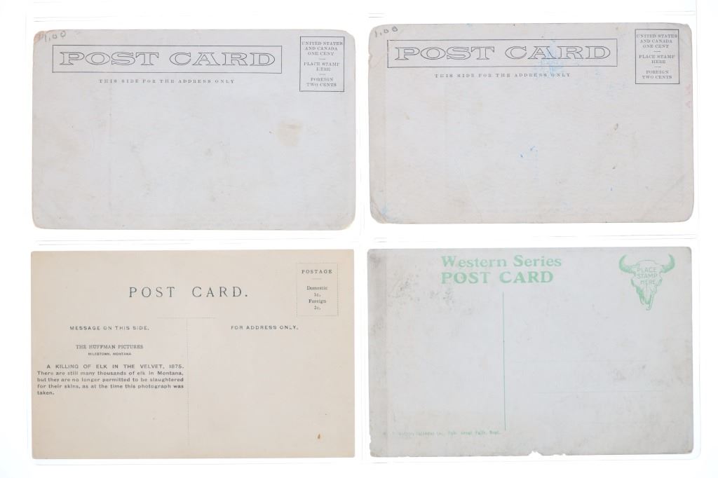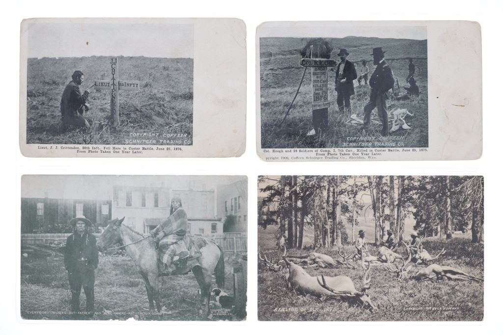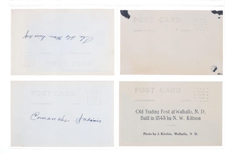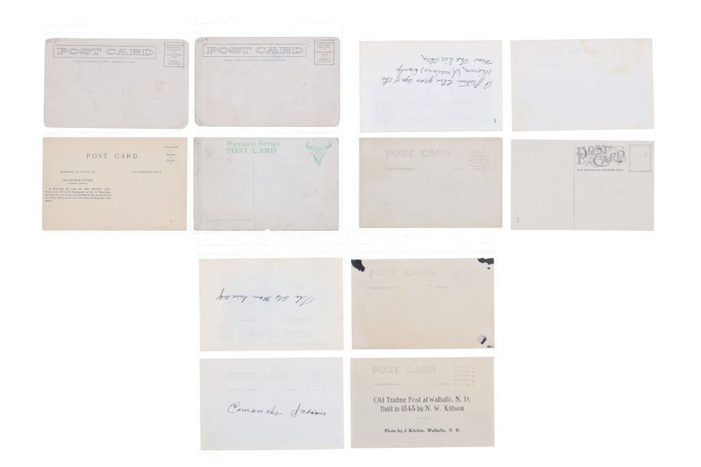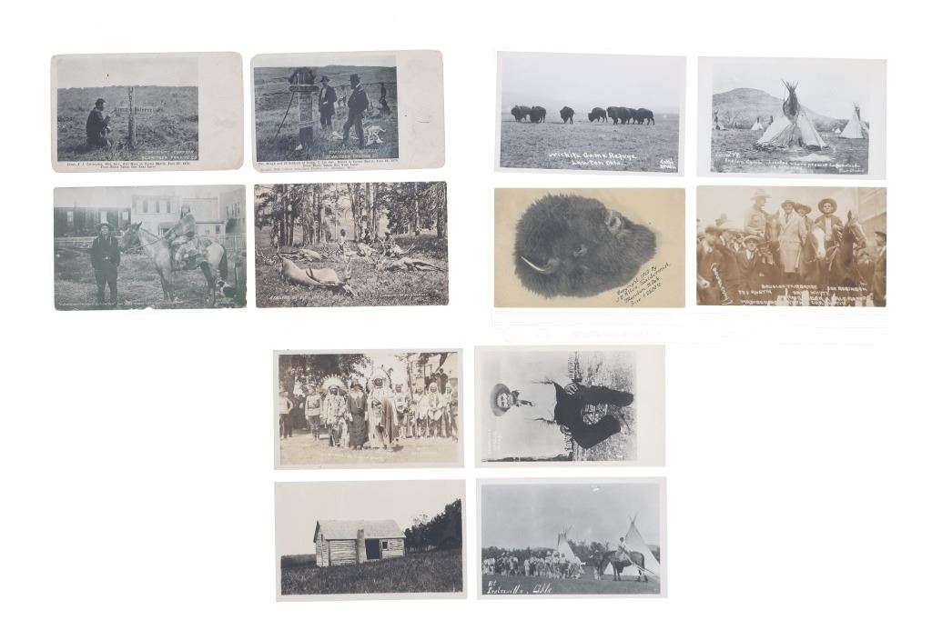 Featured in this lot are twelve, photo postcards from various photographers showing various locations and people circa early 1900s, from the ex-collection of the C.M. Russell Museum and John Kleinschmidt. Four post cards are prints, while the other eight are real photo postcards. The photos include photographers such as J. Kitchen, B.L. Brigham, Post's Studio, Ralph Doubleday and L.A. Huffman. The photo postcards show scenes such as, Lieut. J.J. Crittenden painting a cross at the Custer Battle site, hunting of elk, Bull Head and White Bear, Apache Chief Geronimo, a small house, Craterville, Oklahoma Native Americans, Buffalo on the Wichita Game Refuge, J.D. Allen's taxidermied buffalo and a Native American camp near Lake Latonka. Some of the photo postcards have show writing on the back, but is limited and clean. They show good condition overall with some wear present from their age and use over the years, but no major damage is noted. They are set in plastic sleeves to preserve their condition. They measure 5 1/2" L x 3 3/8" W and have a collective weight of under 6 ounces.