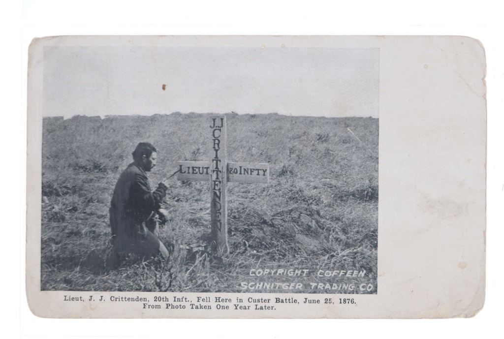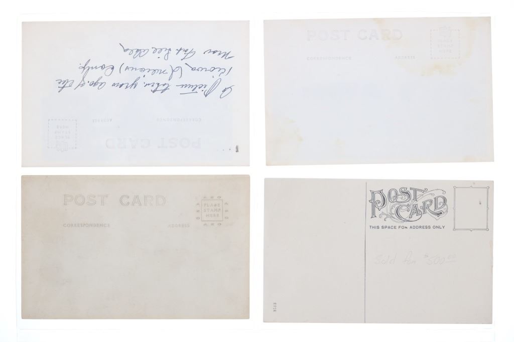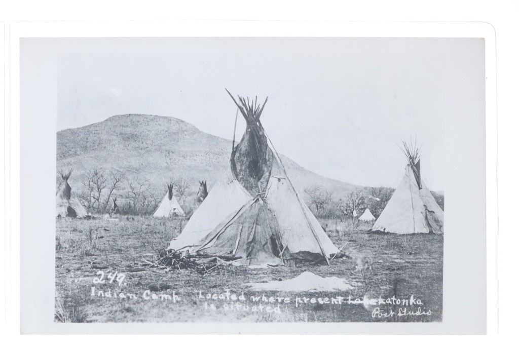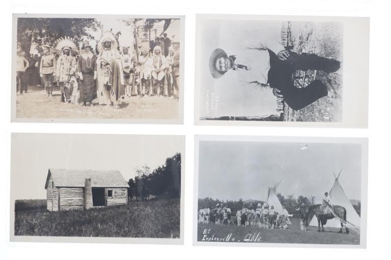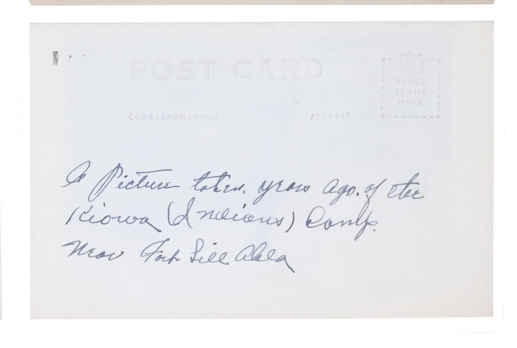 Featured in this lot are twelve, photo postcards from various photographers showing various locations and people circa early 1900s, from the ex-collection of the C.M. Russell Museum and John Kleinschmidt. Four post cards are prints, while the other eight are real photo postcards. The photos include photographers such as J. Kitchen, B.L. Brigham, Post's Studio, Ralph Doubleday and L.A. Huffman. The photo postcards show scenes such as, Lieut. J.J. Crittenden painting a cross at the Custer Battle site, hunting of elk, Bull Head and White Bear, Apache Chief Geronimo, a small house, Craterville, Oklahoma Native Americans, Buffalo on the Wichita Game Refuge, J.D. Allen's taxidermied buffalo and a Native American camp near Lake Latonka. Some of the photo postcards have show writing on the back, but is limited and clean. They show good condition overall with some wear present from their age and use over the years, but no major damage is noted. They are set in plastic sleeves to preserve their condition. They measure 5 1/2" L x 3 3/8" W and have a collective weight of under 6 ounces.