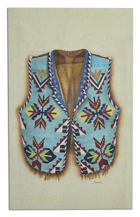 Circa Early 2000, Exquisite signed original watercolor on paper done in great detail and showing a Cheyenne beaded vest. Excellent condition, unframed. 22" x 14"