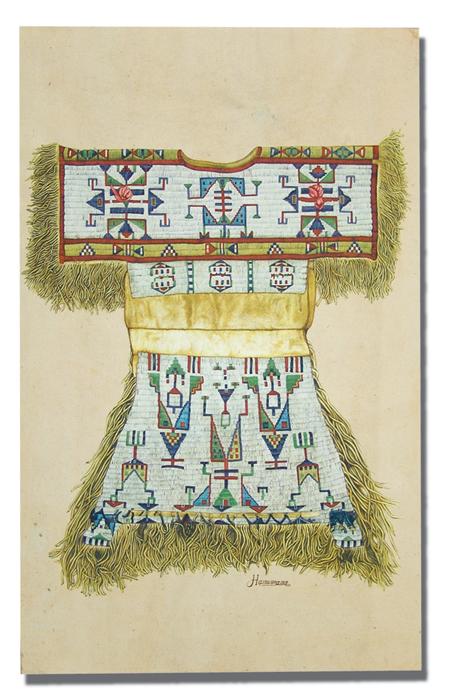 Circa Early 2000, Exquisite signed original watercolor on paper done in great detail and showing a fully beaded Sioux girl's buckskin dress. Excellent condition, unframed. 22" x 14"