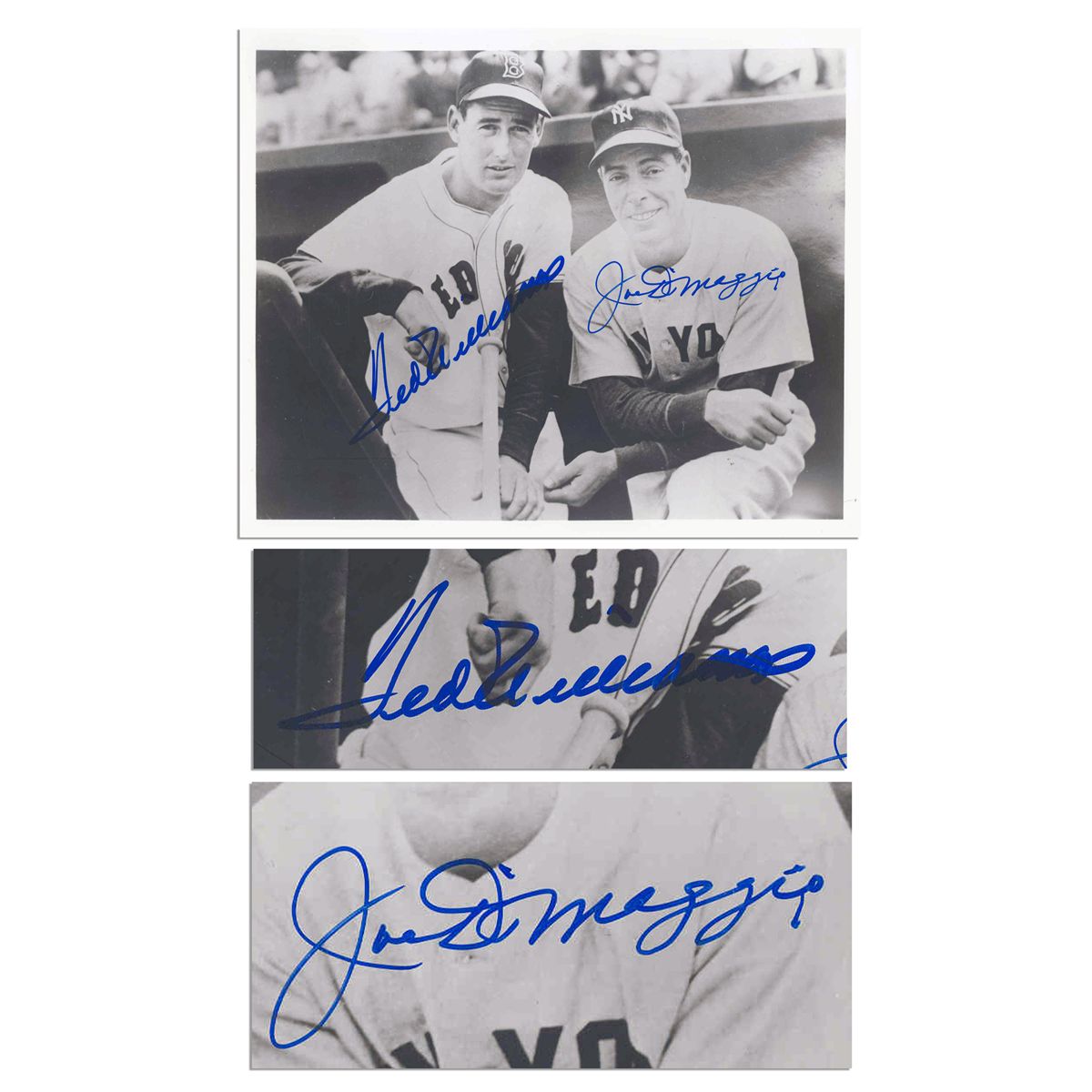 10'' x 8'' glossy photo signed by Joe DiMaggio and Ted Williams. The Boston left fielder and ''The Yankee Clipper'' sign the photo over their images. Some light scuffing to photo not affecting signatures; overall very good. Accompanied by JSA COA.