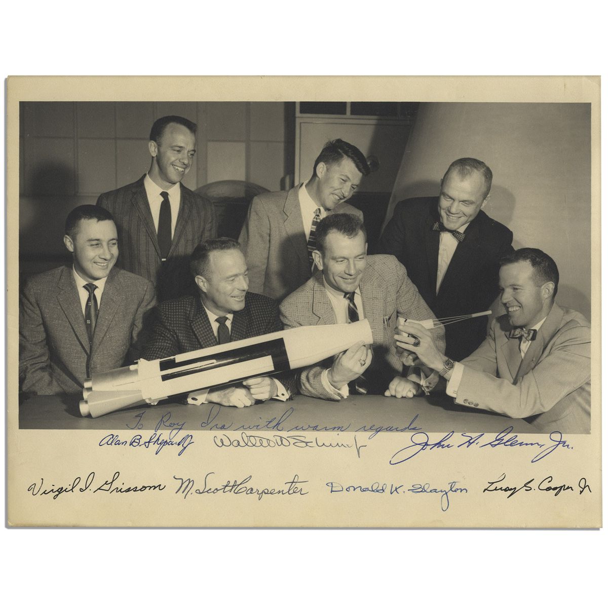 Photo of NASA's original Mercury 7 astronauts, signed by all 7. Black and white photo of the astronauts in civilian blazers interacting with a model spacecraft is signed upon the lower border: ''Alan B. Shepard Jr.'', ''Walter W Schirra Jr'', ''John A. Glenn Jr.'', ''Virgil I. Grissom'', ''M. Scott Carpenter'', ''Donald K. Slayton'' and ''Leroy G. Cooper Jr''. With a dedication by an unknown hand just under the image, ''To Roy Ira with warm regards''. Matte-finish photo measures 10'' x 8''. Toning, else near fine.