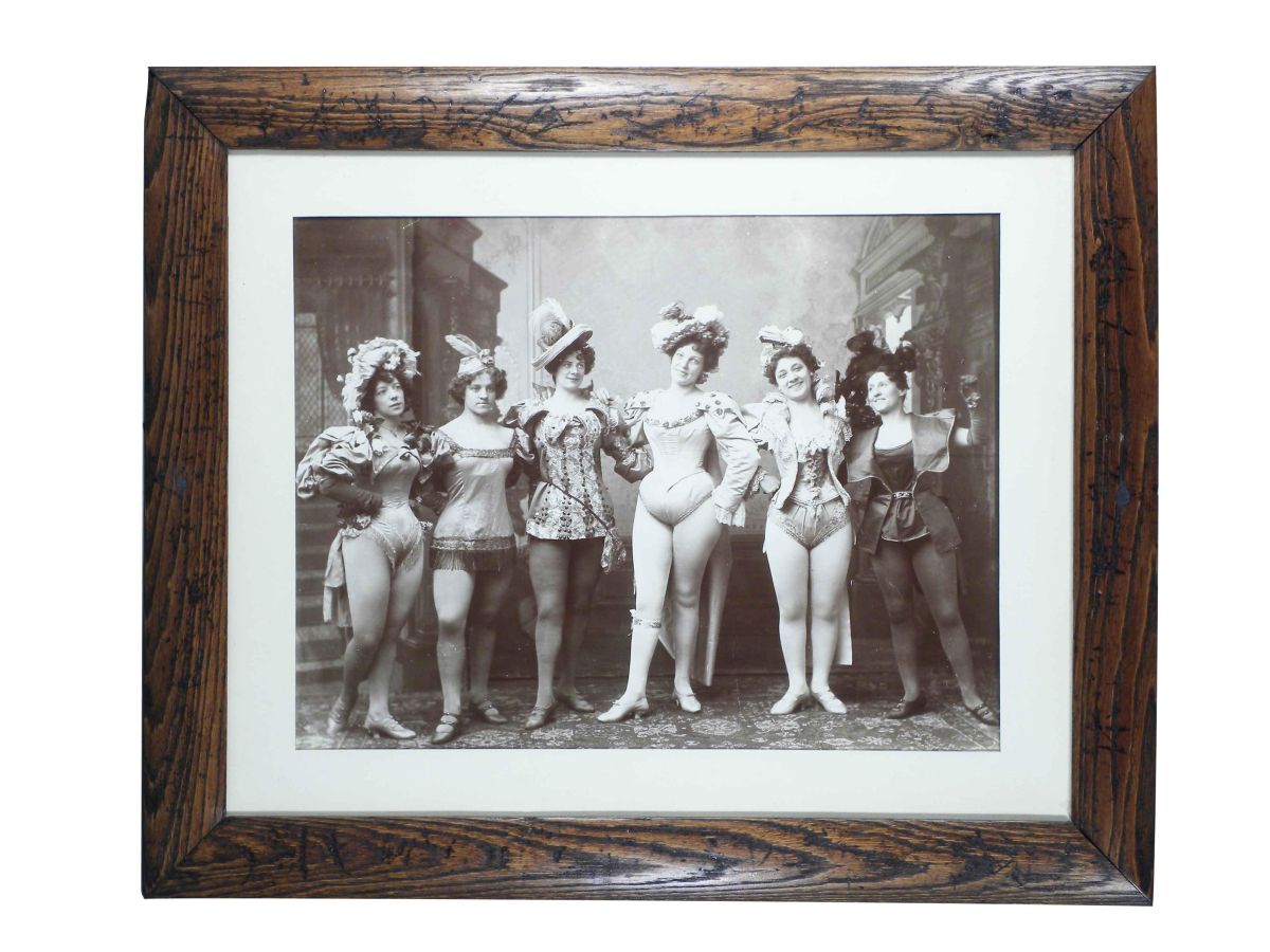 Cardboard Photo of Six Turn of the Century Saloon Girls, in period frame. Excellent condition. 17 X 13 inches image only.