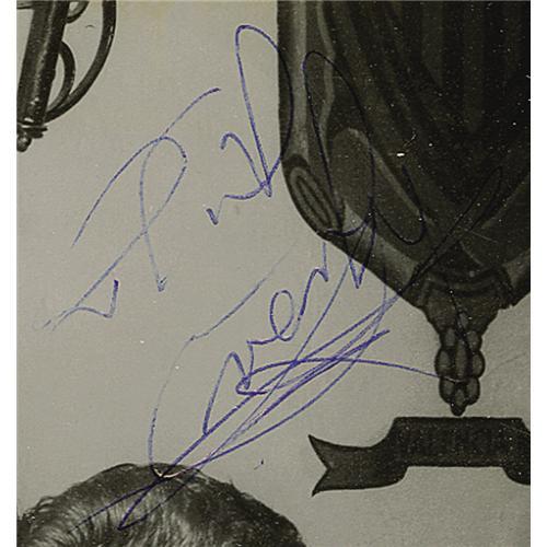 <B>Photo of the Hollys and Everlys signed by Phil Everly.</B></I> This 8" x 10" b&w photo of Buddy Holly, his then new bride Maria Elena Holly, Phil Everly, and Everly's wife Jackie, was taken during a meal at the El Chico restaurant in New York City. The photo is signed by Everly in the upper right corner and matted in a commemorative holder from the restaurant to an overall size of 11" x 9". In great condition with some wear and soiling to the holder, and almost no wear to the photo itself. This was Buddy's personal copyand is a poignant and important treasure. <I>With COA from Maria Elena Holly.</B></I>