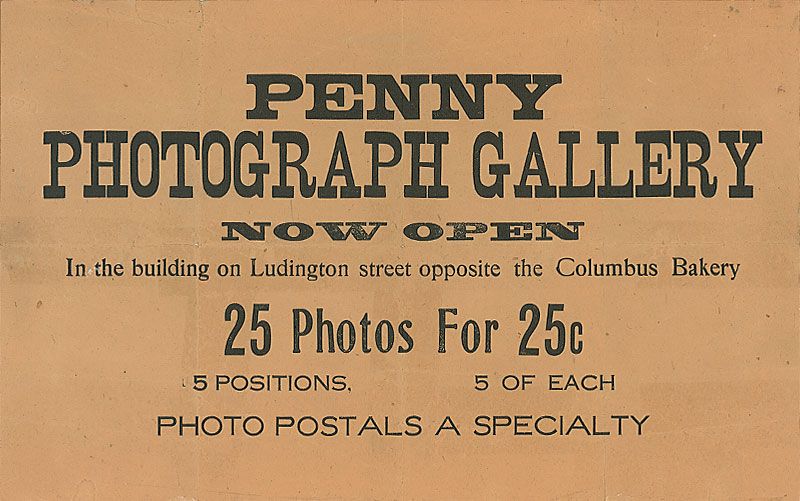 Thin paper advertising sign for a new gallery, 11.75 x 7.5, bearing the text: “Penny Photograph Gallery Now Open, In the building on Ludington street opposite the Columbus Bakery, 25 Photos For 25c, 5 Positions, 5 Each, Photo Postals a Specialty.” In very good condition, with intersecting folds with slight separations and scattered creases.