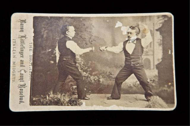 Photograph mounted on card, approx. 2-3/8” by 4”, reads The brothers, Barron Littlefinger and count Rosebud, Italian midgets, dueling with swords. Photographer’s information on back. San Francisco, CA. late 19th to early 20th century. Image shows some small losses and staining. From the William R. Orbelo Collection. Est: $100 - $300