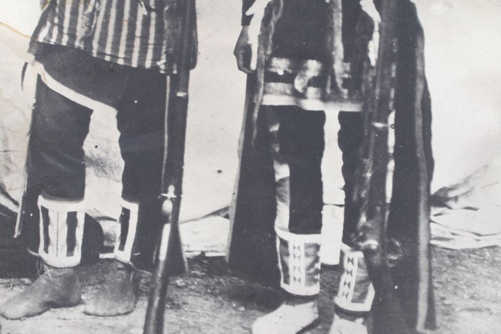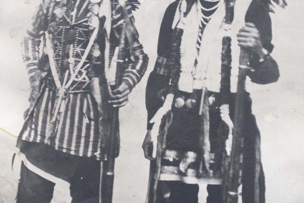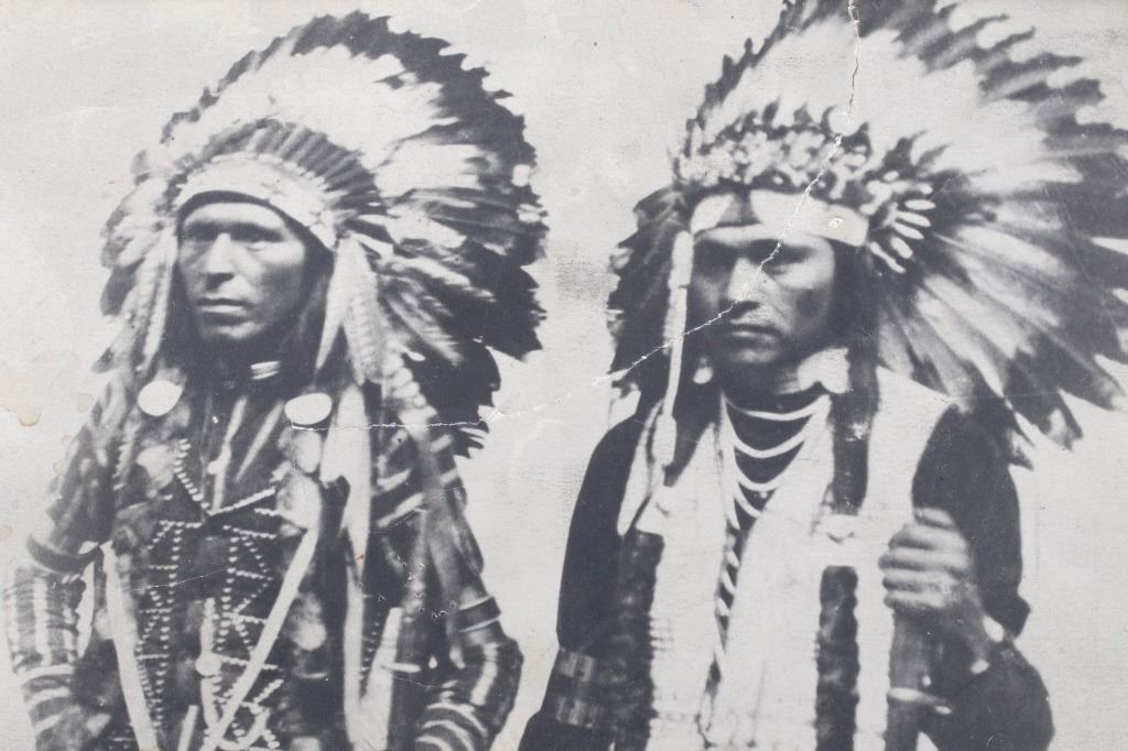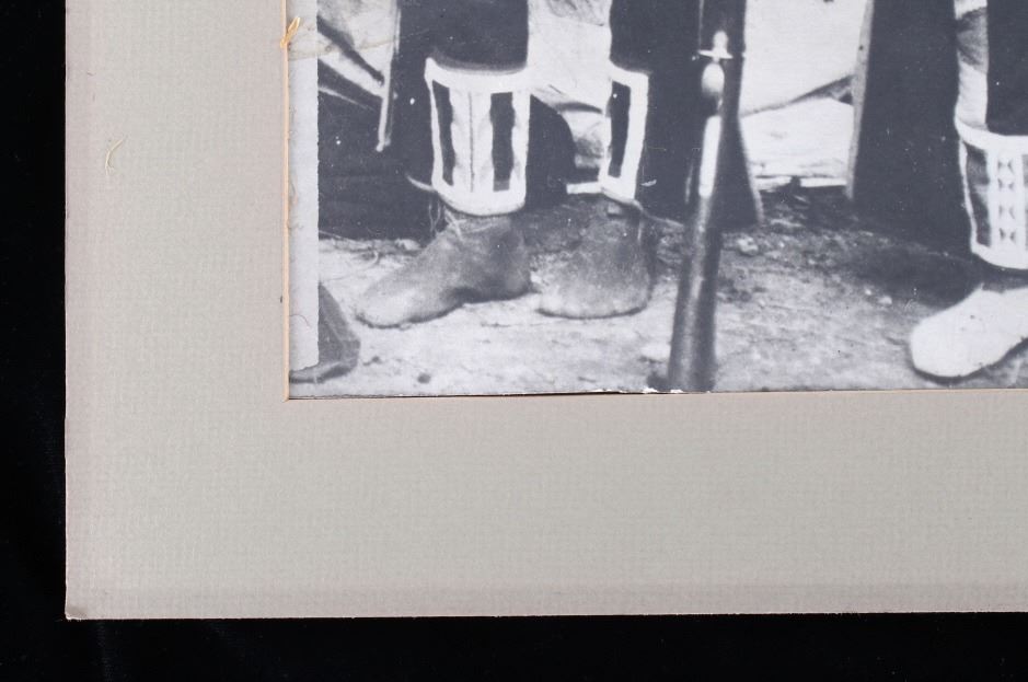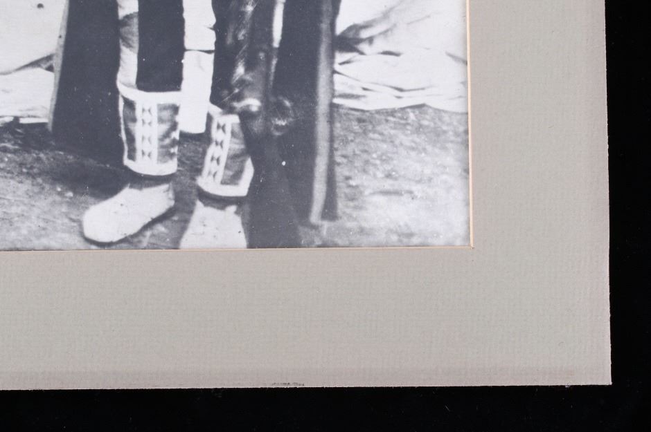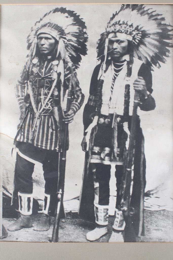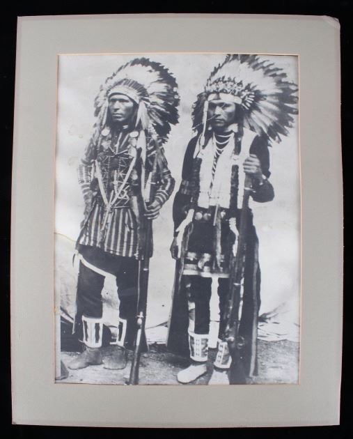 Offered in this lot is a photograph of two American Indian chiefs. The Chief on the left is said to be "Red Thunder" (a nephew of Chief Joseph); the chief on the right is said to be Black Pine Pitch, according to the previous collector. The photograph is in a paper matte and does show quite a bit of damage and wear, as well as a tear in the photograph. The matting measures 20" x 16".