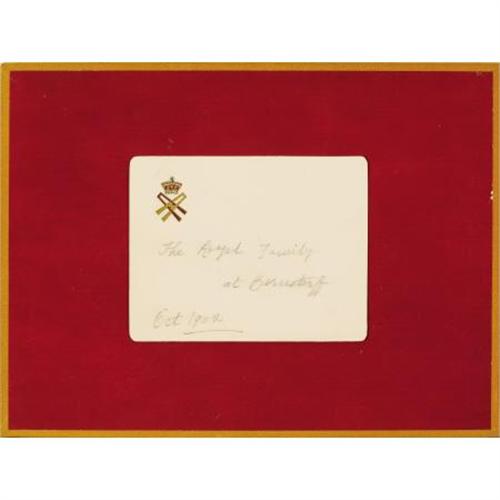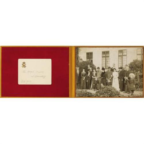 <B>Original Presentation Photograph of Alexandra, Queen Consort of Britain</B></I><BR><BR>A photograph of the Royal family, at Bernstorff, dated October 1902, in Royal yellow silk presentation cover, 7 x 10 in. <BR><BR><b>Shipping:</b> Requires 3rd Party Shipping (<a target="_blank" href="http://www.heritageauctions.com/common/shipping.php">view shipping information</a>)