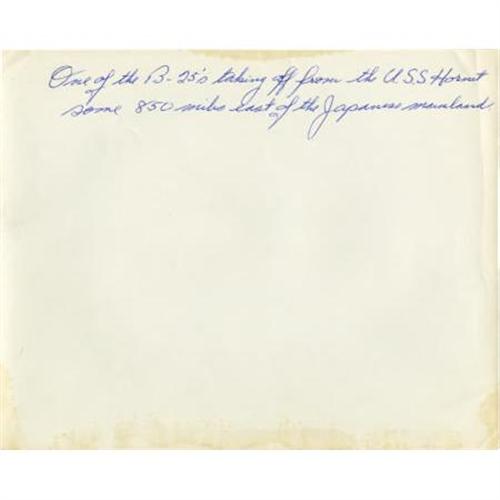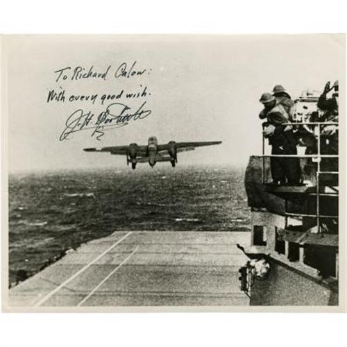 <B>Photograph of B-25 Signed by J.H. Doolittle.</B></I> "<I>To Richard Calow:/ With every good wish./ J.H. Doolittle"</B></I> 10" x 8", black and white print in fine condition. Jimmy Doolittle, hero of 1942's raid on Tokyo, also contributed greatly to aviation sport and science. A winner of every major race during the "Golden Age of Aviation", he was the leading advocate of instrument flying prior to World War II.<BR><BR><b>Shipping:</b> Flat Material, Small (<a target="_blank" href="http://www.heritageauctions.com/common/shipping.php">view shipping information</a>)