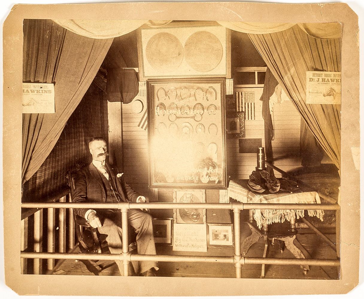 This is a photograph of the Detroit Horse Infirmary of Dr. J. Hawkins Veterinary Surgeon in his booth at an unknown exhibition. The photographer is identified as Alvord & Co., Exclusive Commercial Photographers who were located 55 Rowland St. Detroit. The photograph measures 9.5" x 7.30" and the mat measures 10.70" x 8.45" The photograph and mat and some wear throughout including tears. Date: c1885-1895 Location: Detroit, Michigan HWAC # 44249