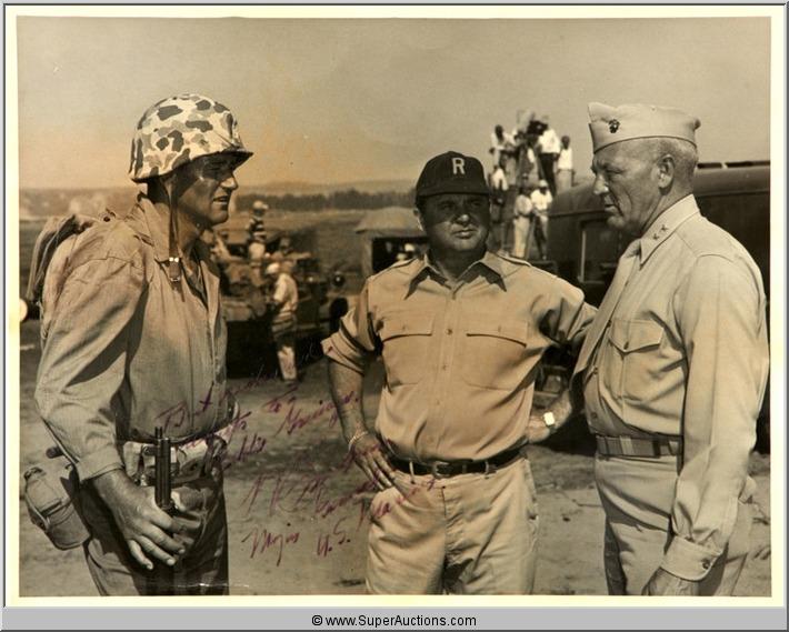 Photograph of Eddie Grainger with John Wayne / Photograph is Autographed TO Eddie Grainger from a Major General U.S. Marines / c. July 15, 1949 / Official Marine Corps Photo / M/Sgt U. P. Dancy / "Watch Your Credit Line" Motion Picture Production Unit / Camp Pendleton, Oceanside, California