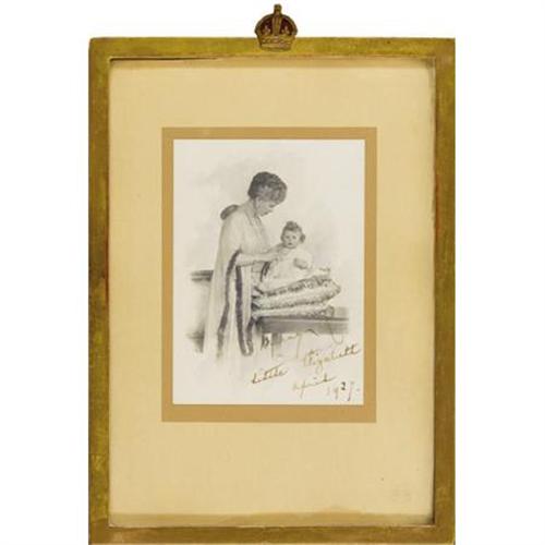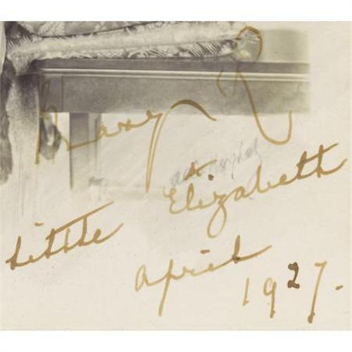 <B>Original Photograph of Queen Mary and Princess Elizabeth</B></I><BR><BR>A rare photograph of Mary, Queen of England, with her granddaughter, Crown Princess Elizabeth, as a child, by A.A. Hughes, inscribed with their names, and dated April 1927, 6 ½ x 4 ½ in., framed in Royal gilt wood presentation frame, 12 ½ x 9 in.<BR><BR>Provenance:<BR>Purchased from Maggs Bros., London<BR><BR><b>Shipping:</b> Requires 3rd Party Shipping (<a target="_blank" href="http://www.heritageauctions.com/common/shipping.php">view shipping information</a>)