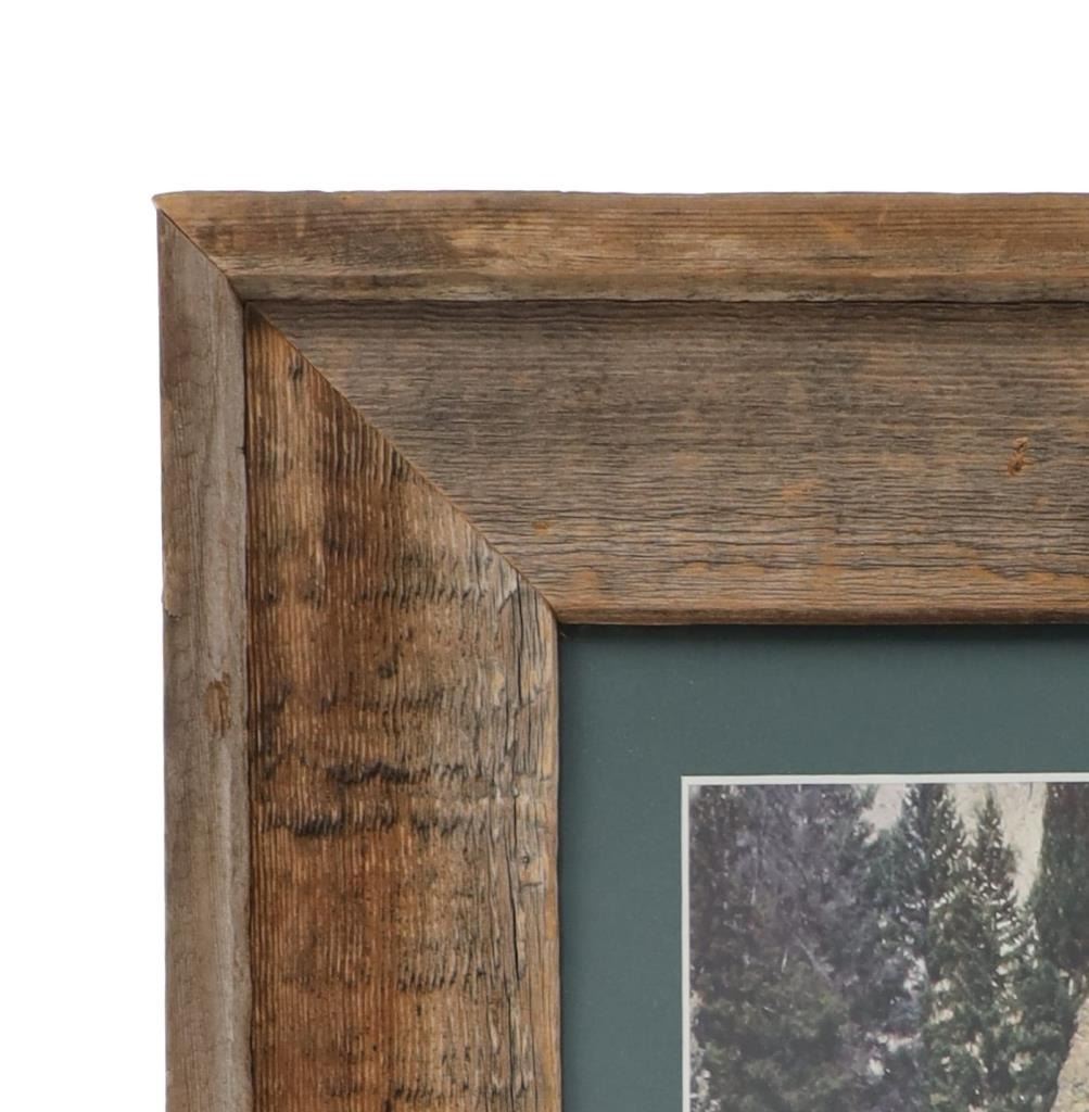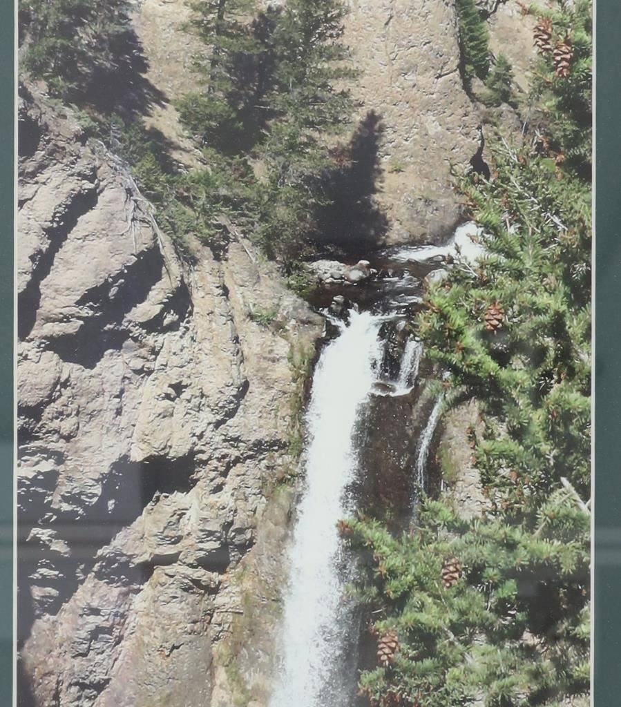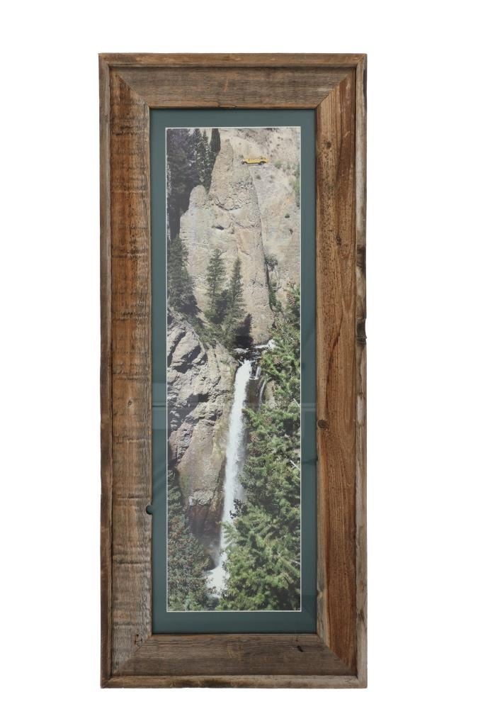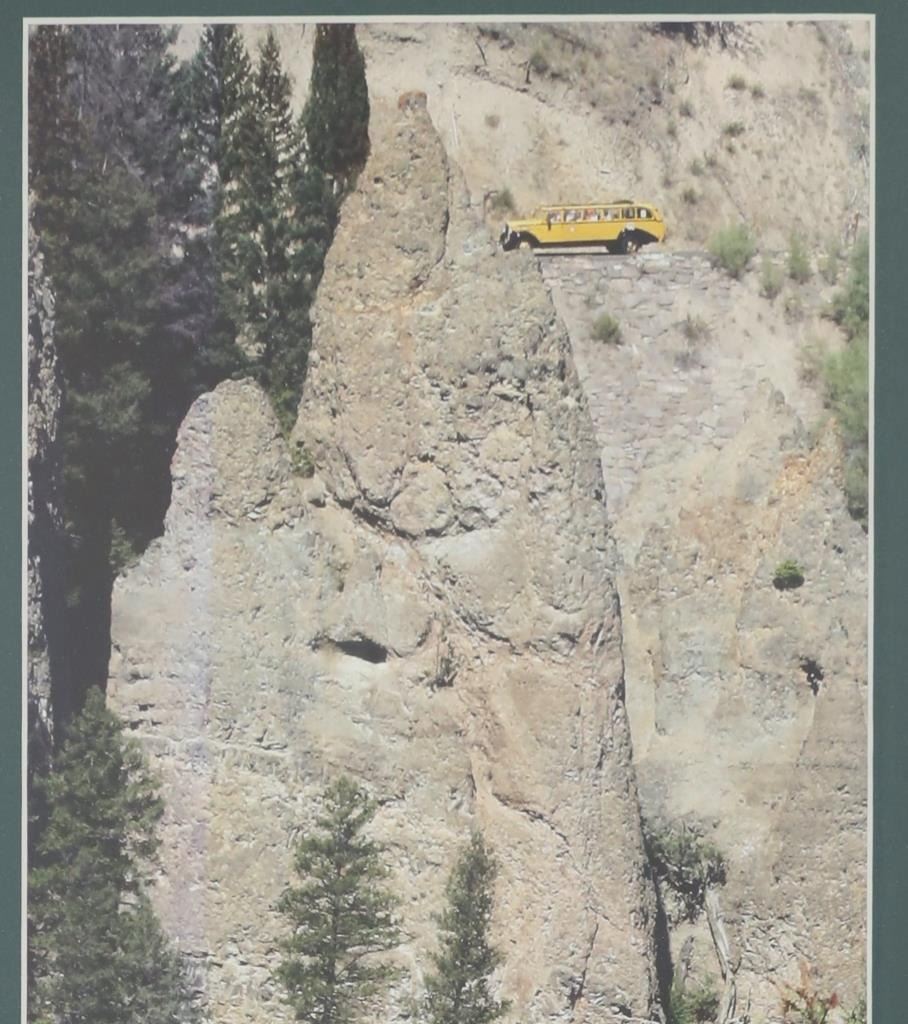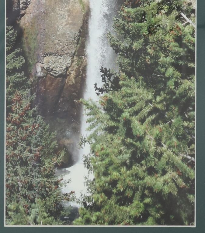 For your consideration is an Original Contemporary Photograph of Tower Fall in Yellowstone National Park, Wyoming. Tower Fall is a waterfall on Tower Creek in the northeastern region of Yellowstone National Park, in the U.S. state of Wyoming. Approximately 1,000 yards upstream from the creek's confluence with the Yellowstone River, the fall plunges 132 feet. Its name comes from the rock pinnacles at the top of the fall. This stunning colour photograph features Tower Fall while above it a Vintage Yellowstone Park Yellow Touring Car is seen on the Tower-Canyon road. The photograph is mounted in a matted rustic wood frame, the photograph and frame are in very nice condition. Visible art measures 9"W x 32.5"L, frame is 17.5"W x 41.75"L x 1"D, weight is 7lb, 2oz.