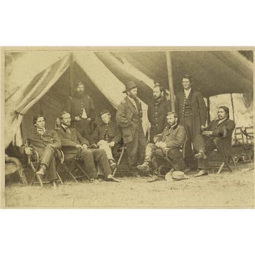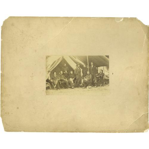 <B>Photograph with General Grant and Staff Featuring Colonel Ely Parker.</B></I> Parker, at right, a Seneca Indian, is quite rare in photos. He transcribed the terms of surrender of General Lee's army at Appomattox Court House in 1865. Some of the others in the photo include Generals Rawlins, Comstock, Dunn, and Morgan. Photo is 6" x 4" laid down on a 14" x 11" piece of cardboard.<BR><BR><b>Shipping:</b> Small Flat (<a target="_blank" href="http://www.heritageauctions.com/common/shipping.php">view shipping information</a>)