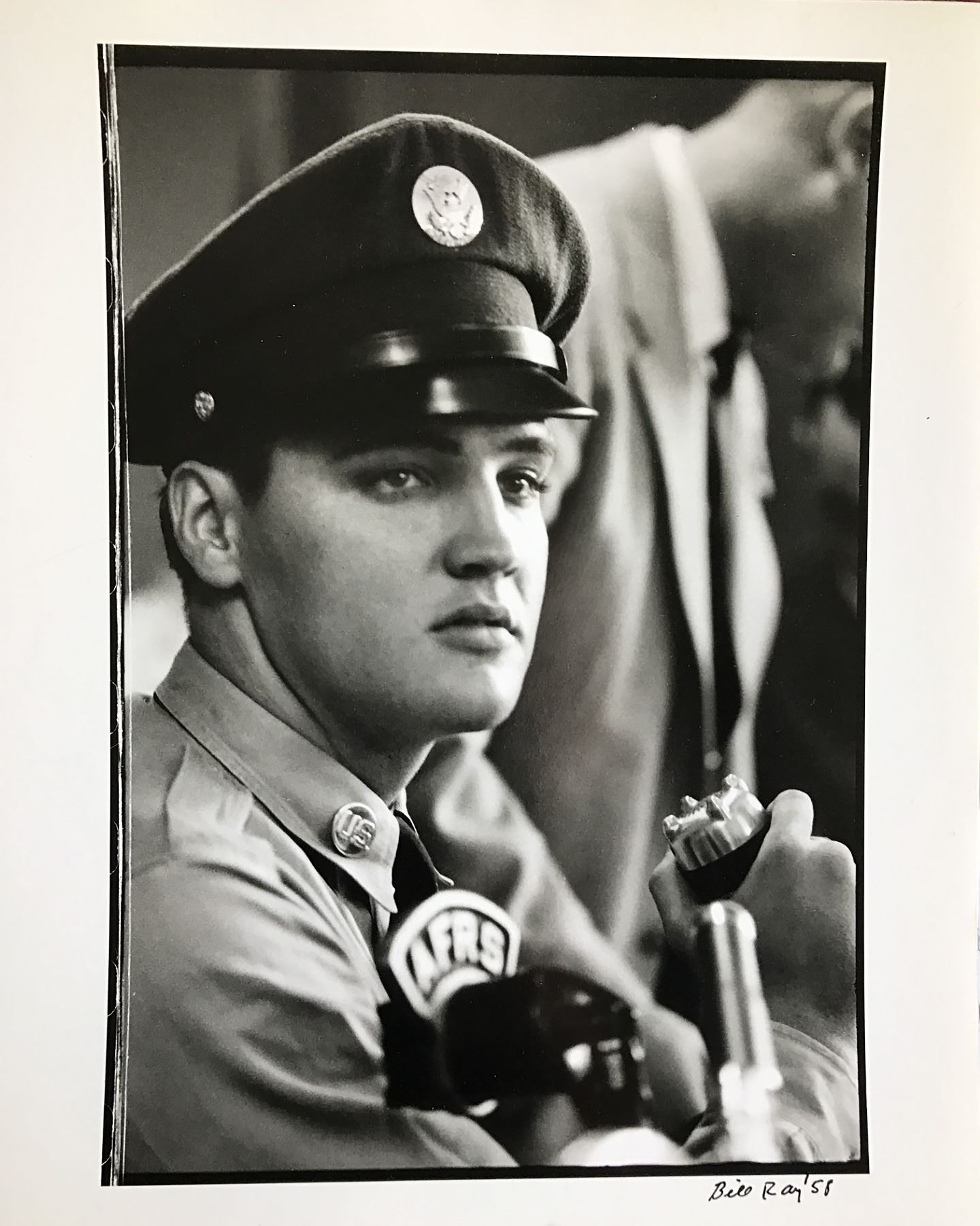 Elvis photographed by Bill Ray during a press conference at the Brooklyn Army Terminal in New York, September 22, 1958. 10x8 inches Signed by Bill Ray in bottom right hand corner.