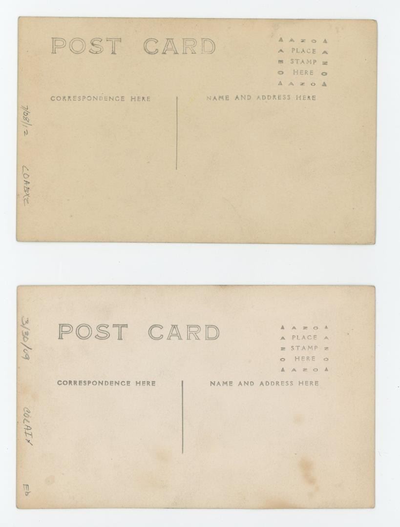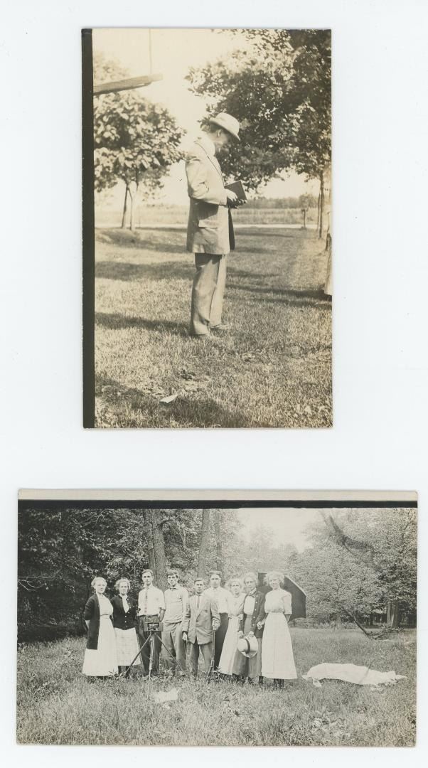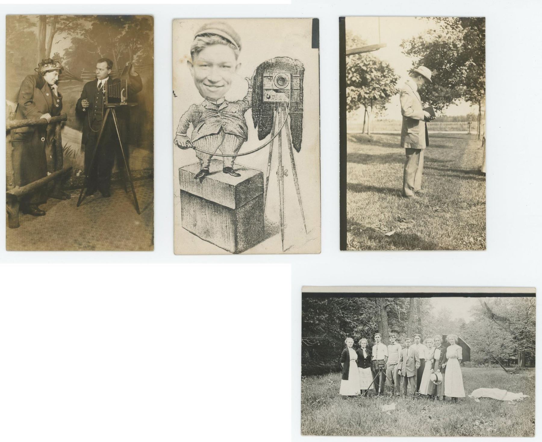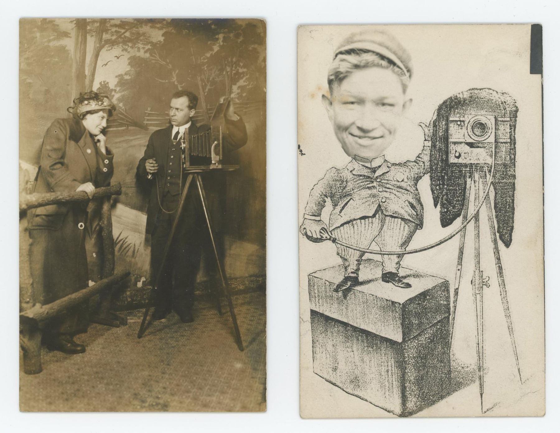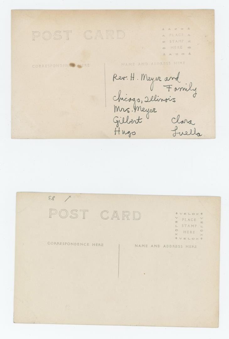 One depicts Reverend H. Meyer and his family in Chicago, Illinois. Also shows one sliced head exaggerated postcard.