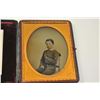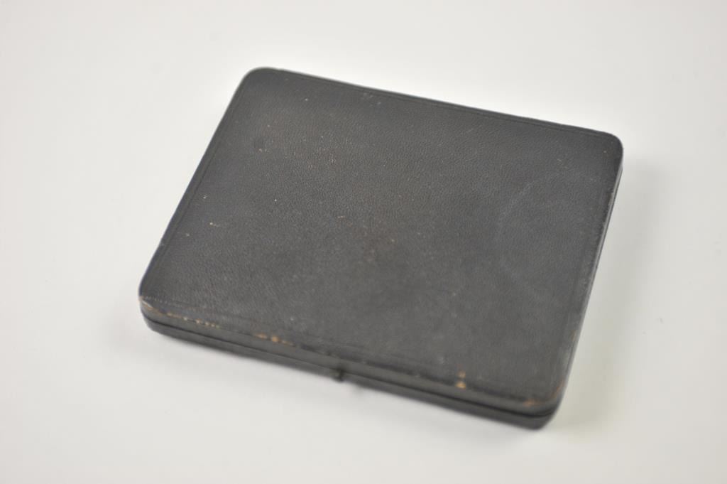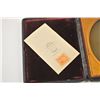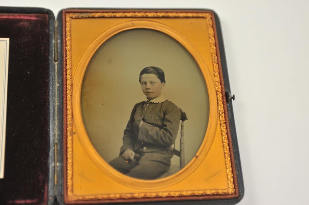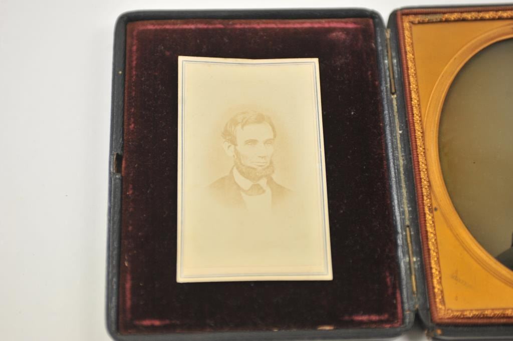 Photographic image lot consisting of an ambrotype depicting a young squire, cased in Moroccan leather with dealer marking on the edges, marked G. Frederick, 585 Broadway (N.Y.), approximately 6” x 4 ½” to theoutside edge of the case. In very good plus to near fine with a hand colored face. The lot additionally includes a Carte D’ Visite of Abraham Lincoln marked on the back, J. Ford Morris-Oswego N.Y.-with the negativepreserved with a cancelled 2 cent tax stamp from the Civil War. Est.: $150-$300.