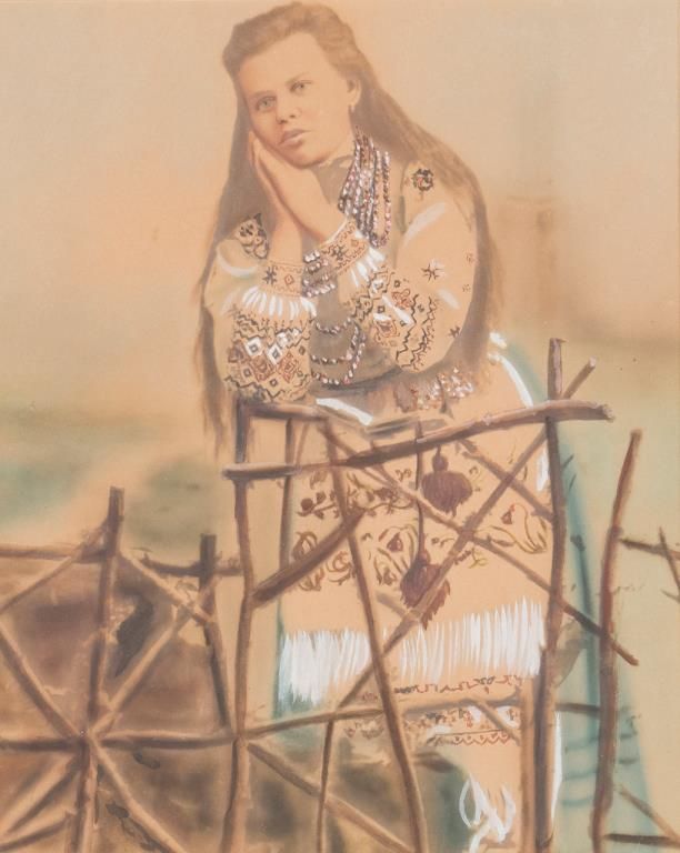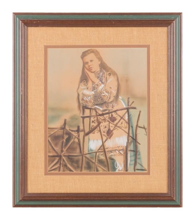Photographic transfer on linen like material enhanced with hand painted watercolor accents circa 1900-1920. Nicely framed and matted. From Santa Barbara California estate; approximate 14"x11" image only. Est.: $150-$300.