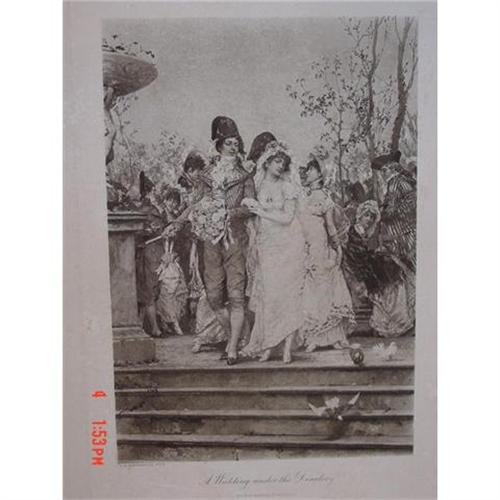 This is a photogravure of "A Wedding under the Directory" by F. H. Kaemmerer. It was published for the George Barrie Collection in 1886. The paper size is 11.75" x 17" and the picture size is 7" x 10.25". There is mild discoloration and spotting in the margin area from age.