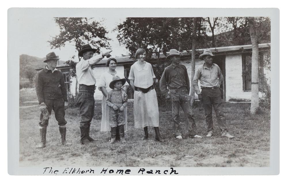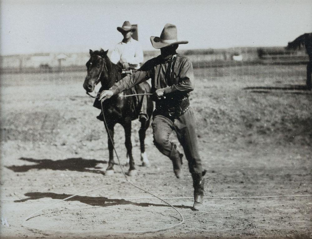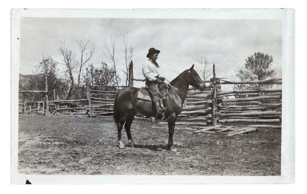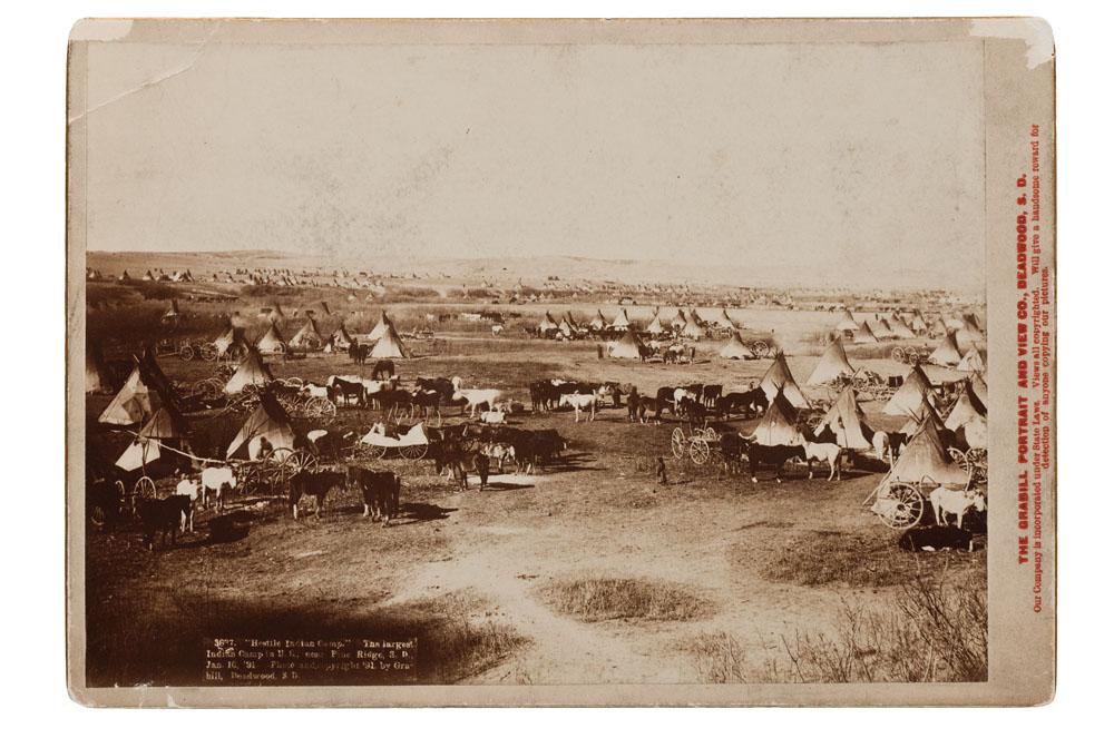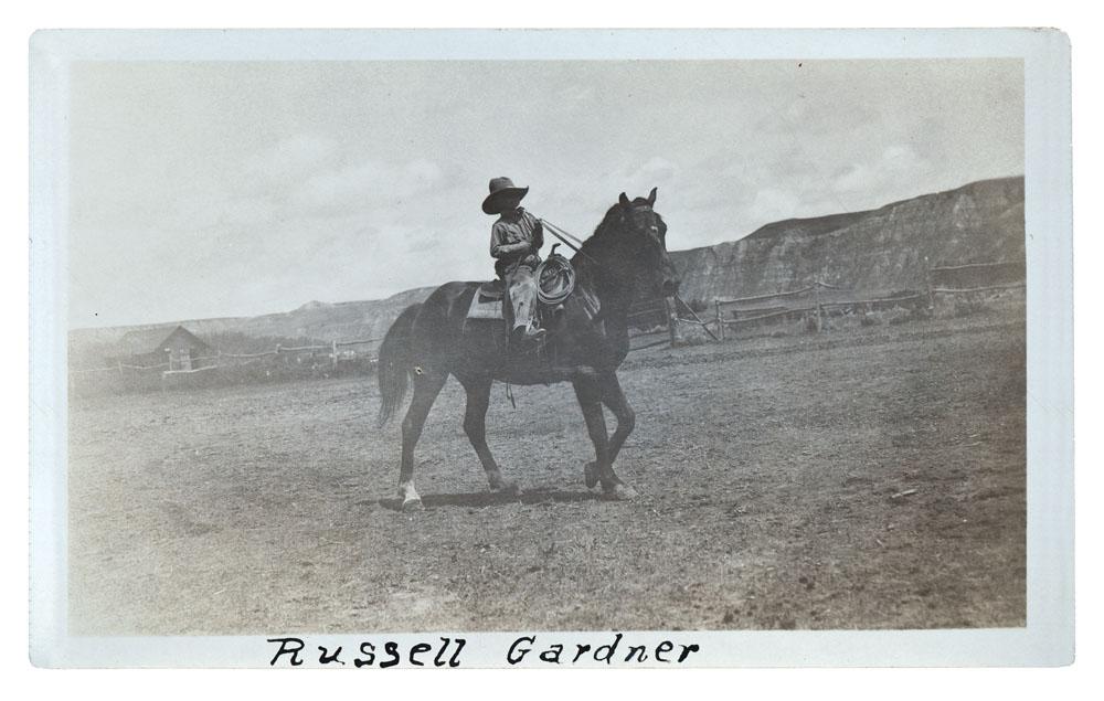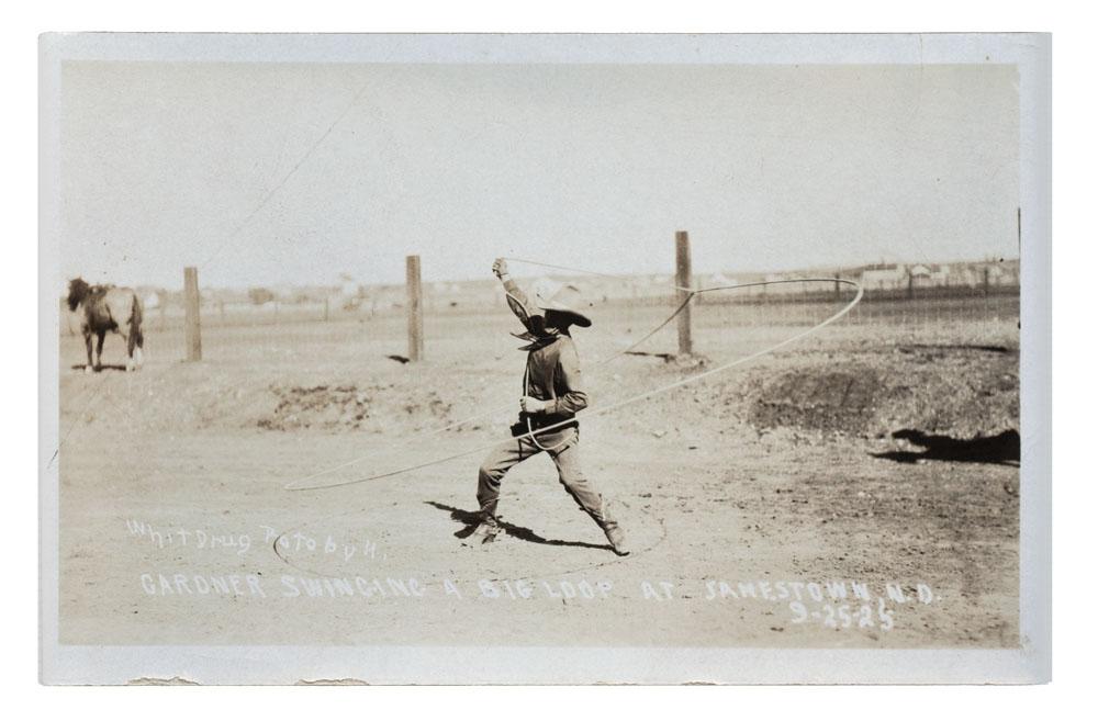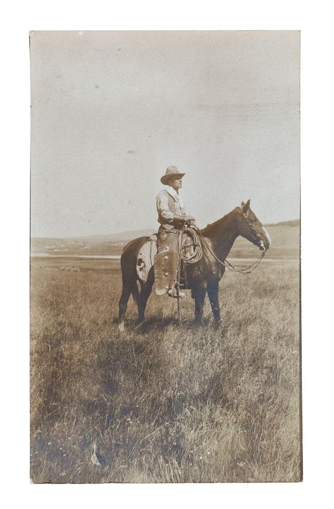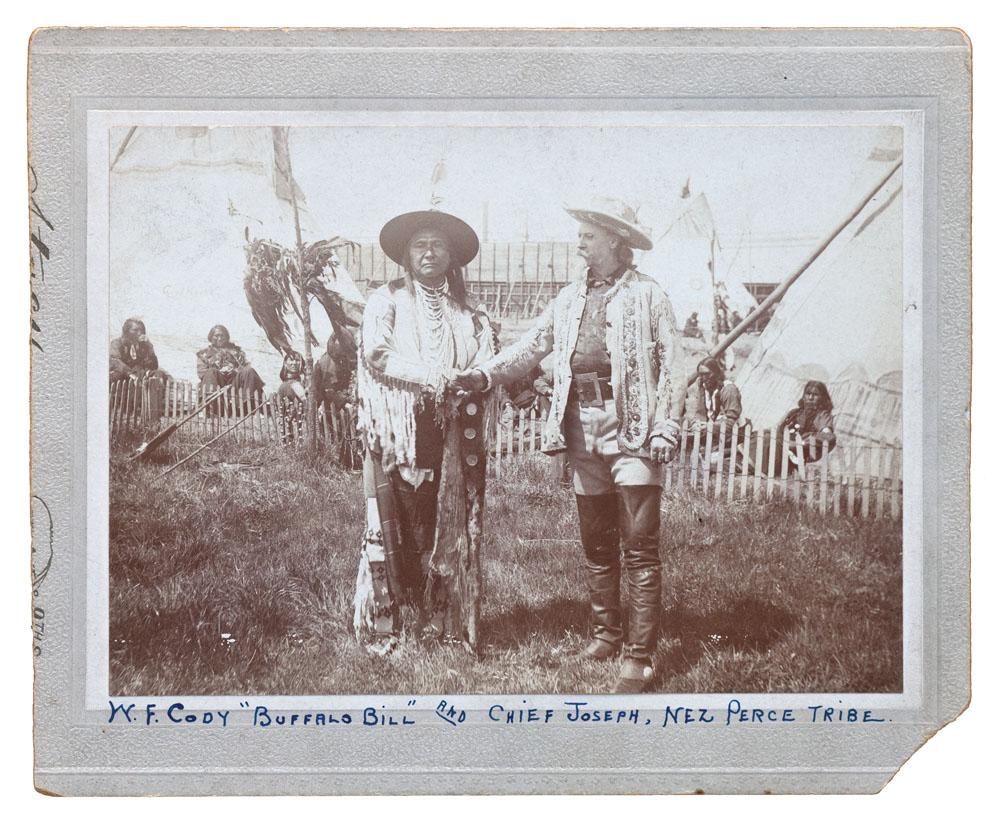 Photos and miscellaneous from Cottle’s collection; a) Trimmed cabinet card of Buffalo Bill Cody and Chief Joseph, image intact and extremely scarce. Notations on bottom margin in pen. b) Albumen print mounted on board with Grabill’s copyright information and advertisement printed along left edge. Hostile Indian Camp. The largest Indian Camp in U.S. near Pine Ridge, S.D./ Jan. 16, ’91. Photo and copyright ’91, by Grabill. Photo taken two weeks after the famous Wounded Knee disaster, this image is one of series taken by Grabill of the Lakota encampments around Pine Ridge, 6 3/4” x 9 3/4” overall. Fine condition; c) Grouping of images: Jordan Cottle horseback with kissing bird bit in horses mouth (postcard back), Photo of George Gardner (doing rope trick), postcard of Gardner (swing big loop), circa 1925 North Dakota photos of the Russells at the Elkhorn Home Ranch, Russell Gardner (child on horseback), The Gardner family, and one of Russell mounted on horseback.