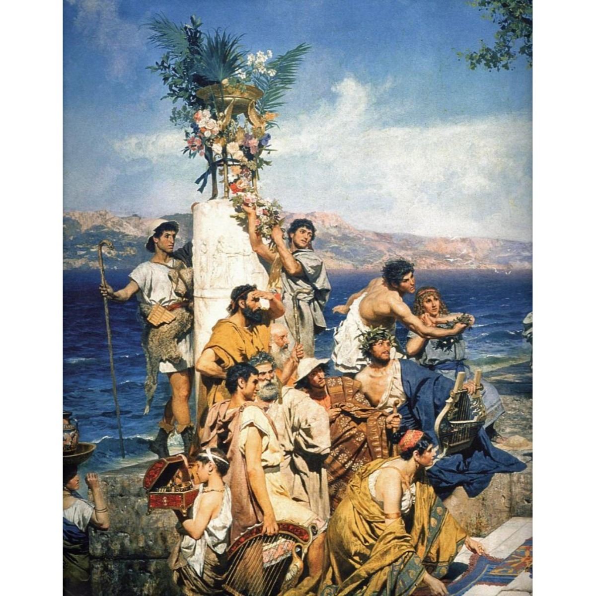 Monumental Painting: Henryk Siemiradzki (79†X 39..5â€) – After, by the School of bianco. Phryne at the Festival of Poseidon in Eleusin Phryne at the Festival of Poseidon in Eleusin. The subject is from the Greek author Atheneus Naucratis. According to him, in the IV century BC, in Megara lived a young woman, Phryne, who was as beautiful as a Goddess. She was the model for Aphrodite of Knidos by the ancient sculptor Praxiteles, her lover, and for Aphrodite Anadyomene by the artist Apelles. Once Phryne dared to challenge the Goddess of love and came to Eleusin on the day of Poseidon Festival. The beauty came to a sea-shore, where, according to a myth, Aphrodite first appeared in Greece. When a festival procession was moving from Poseidon's Temple to the sea, Phryne stripped herself to amazement and delight of the public. Later she was charged for insulting the Gods. Commissioned for a Private Collection from the School of Bianco and signed r. bianco (see www.rbianco.com for details).The painting being sold is brush-stroke for brus-stoke recreation by a master artist. A priceless piece of art. Finest canvas, oil, shipped in roll to be framed professionally upon arrival. Â