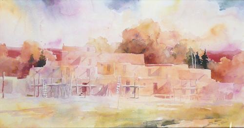 Phyllis Meyer (1931 - 2005) Watercolor Pueblos Signed lower left 16" x 30"