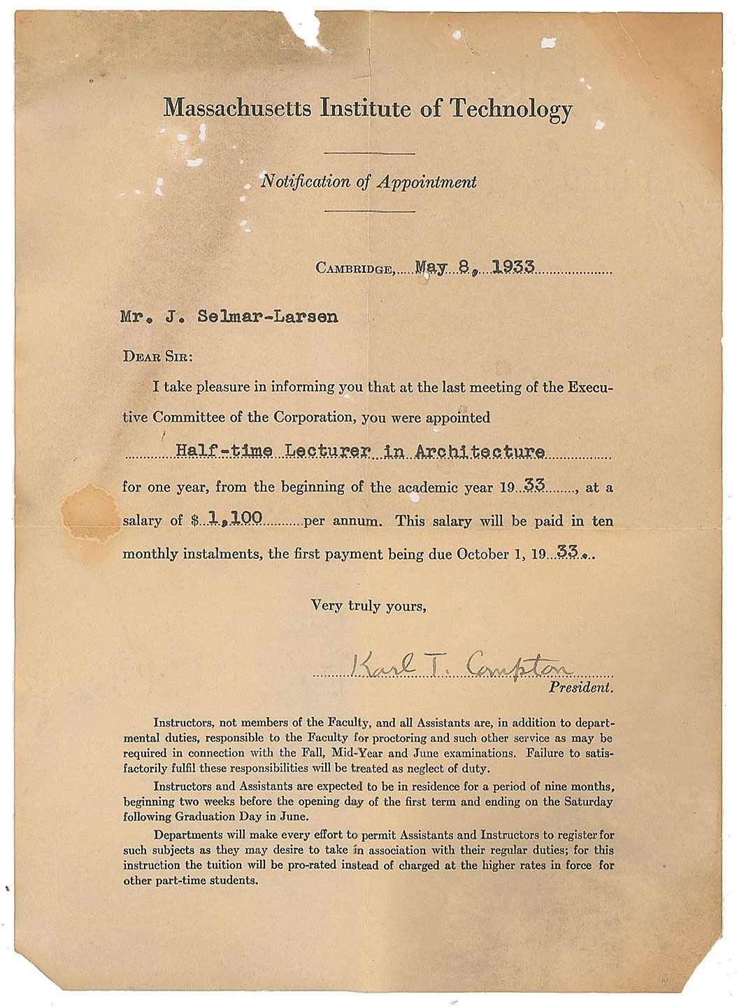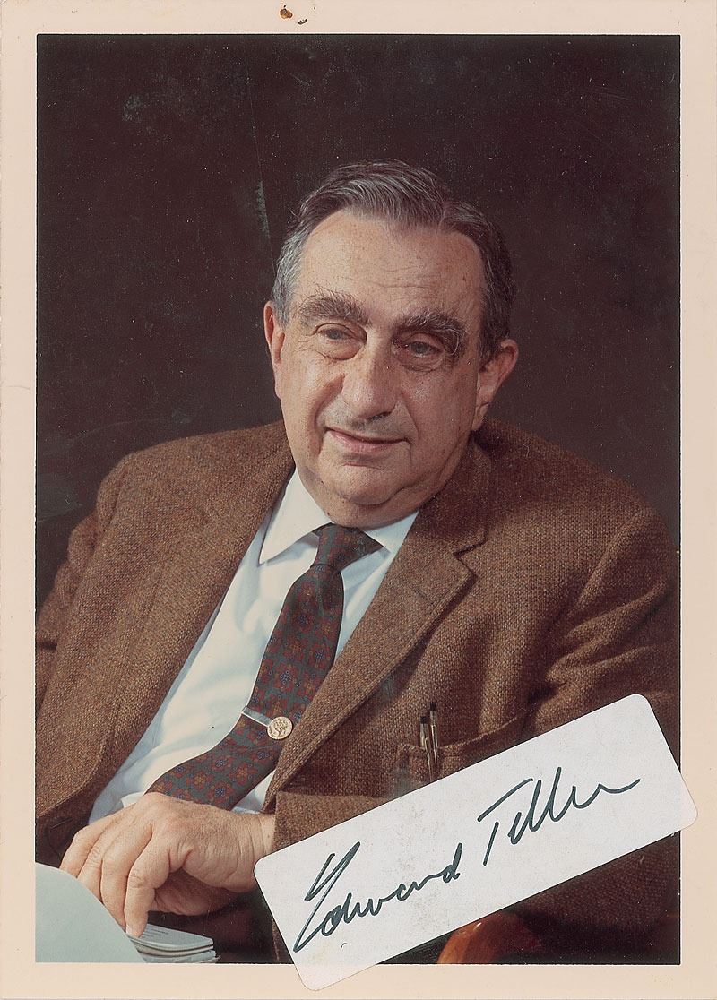 Two items: a felt tip signature, “Edward Teller,” on an off-white 3 x 1 label affixed by Teller to a color glossy 5 x 7 photo; and a DS signed “Karl T. Compton,” one page, 6.5 x 9, May 8, 1933, a Massachusetts Institute of Technology notification of appointment for J. Selmar-Larsen to be a “half-time Lecturer in Architecture,” for a salary of $1100. The Teller signature is in fine condition; the Compton document is in very good condition, with a vertical fold through a single letter of signature, scattered tears and stains, and paper loss to upper portion. Accompanied by the original mailing envelope for the Teller signature.