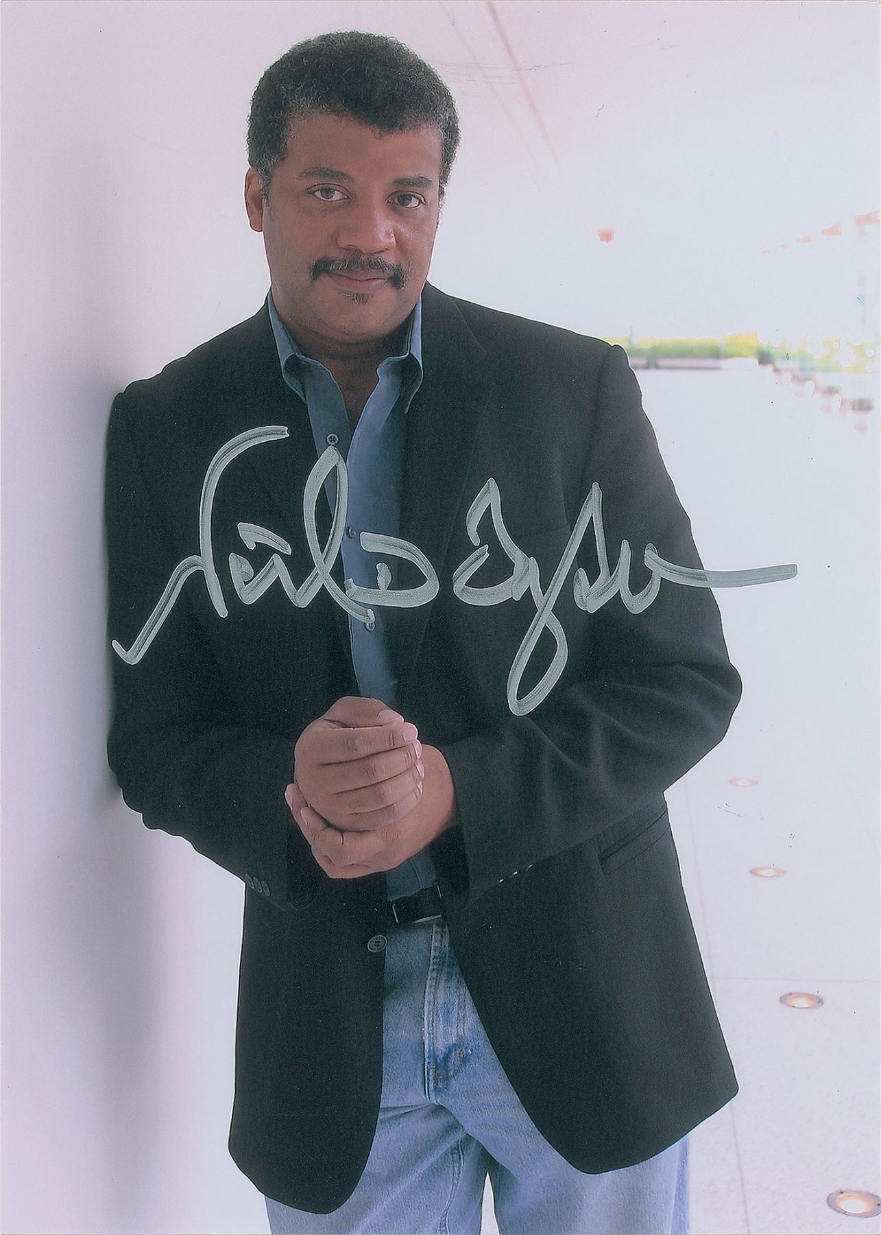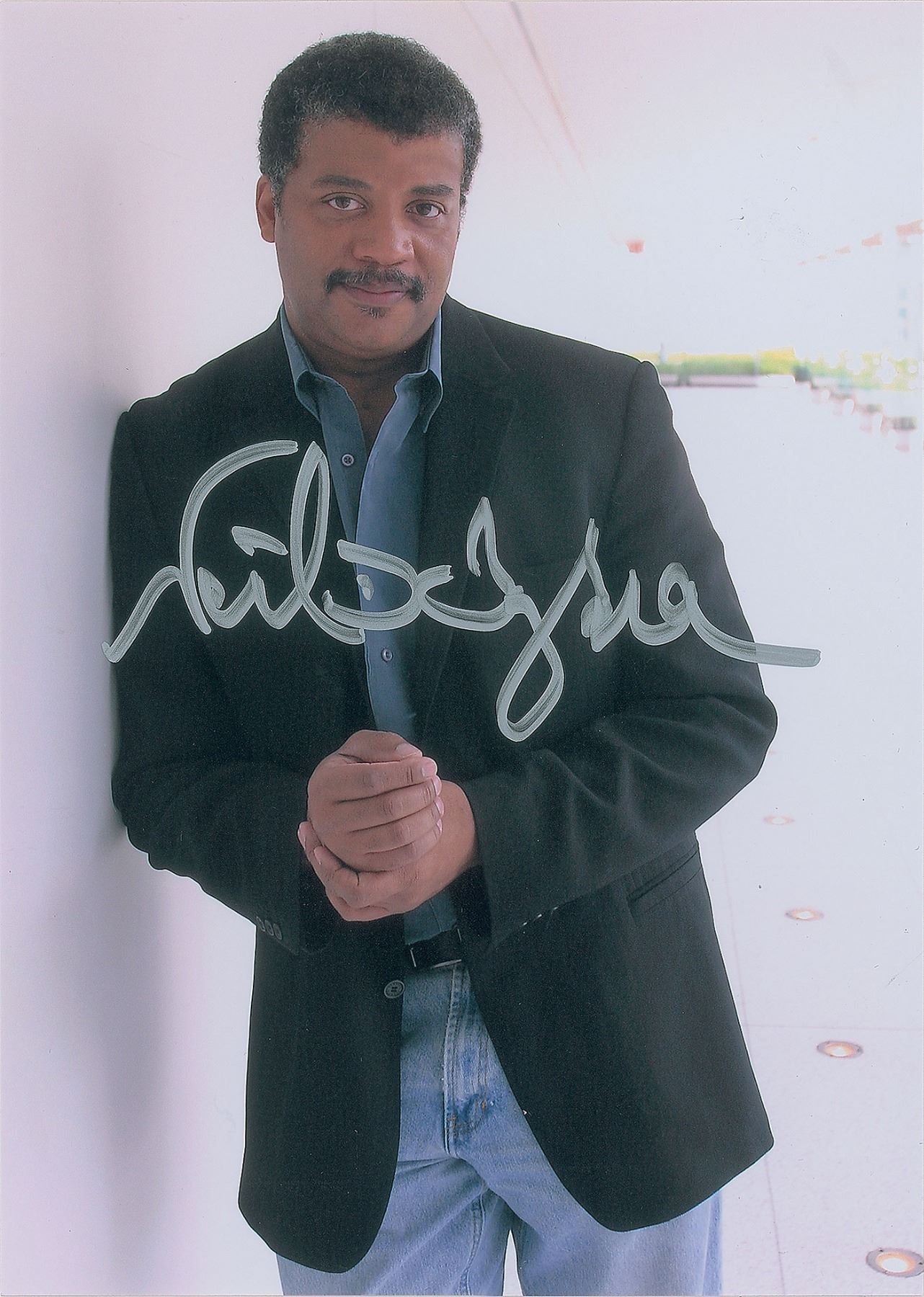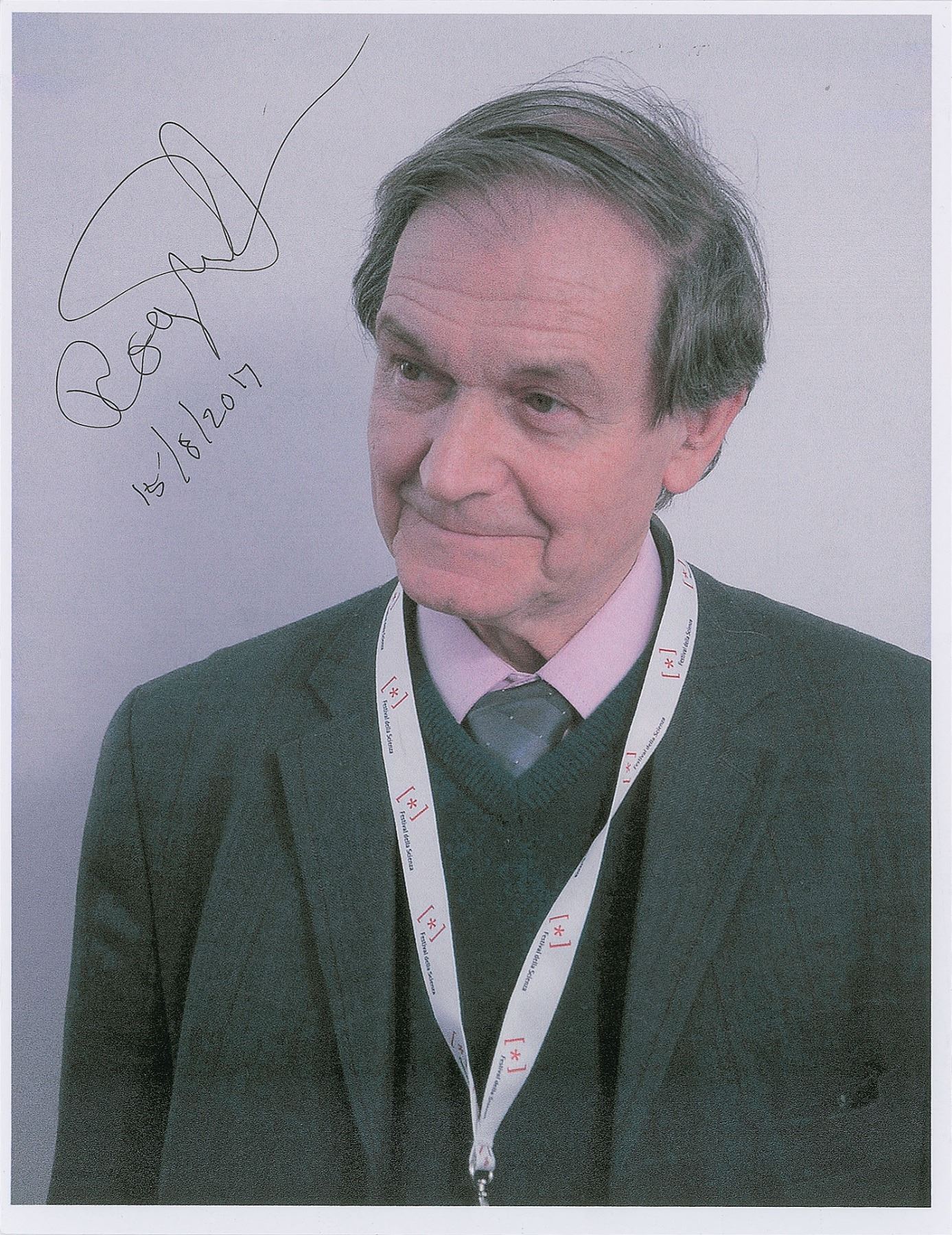 Group lot of seven color photos, semi-glossy and laserprint, ranging in size from 5 x 7 to 11.75 x 8.25, each signed in ink or felt tip by the pictured physicist, including: Freeman Dyson, Kip Thorne (ins), Peter Higgs (ins), Roger Penrose, and Neil deGrasse Tyson (3). In overall very fine condition.