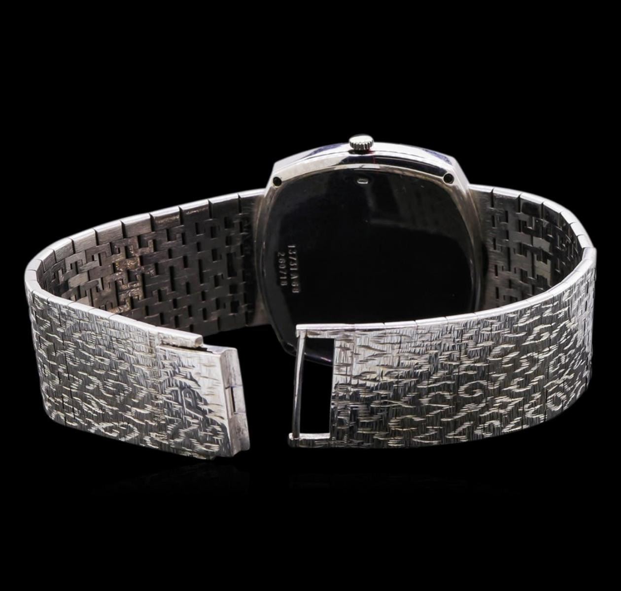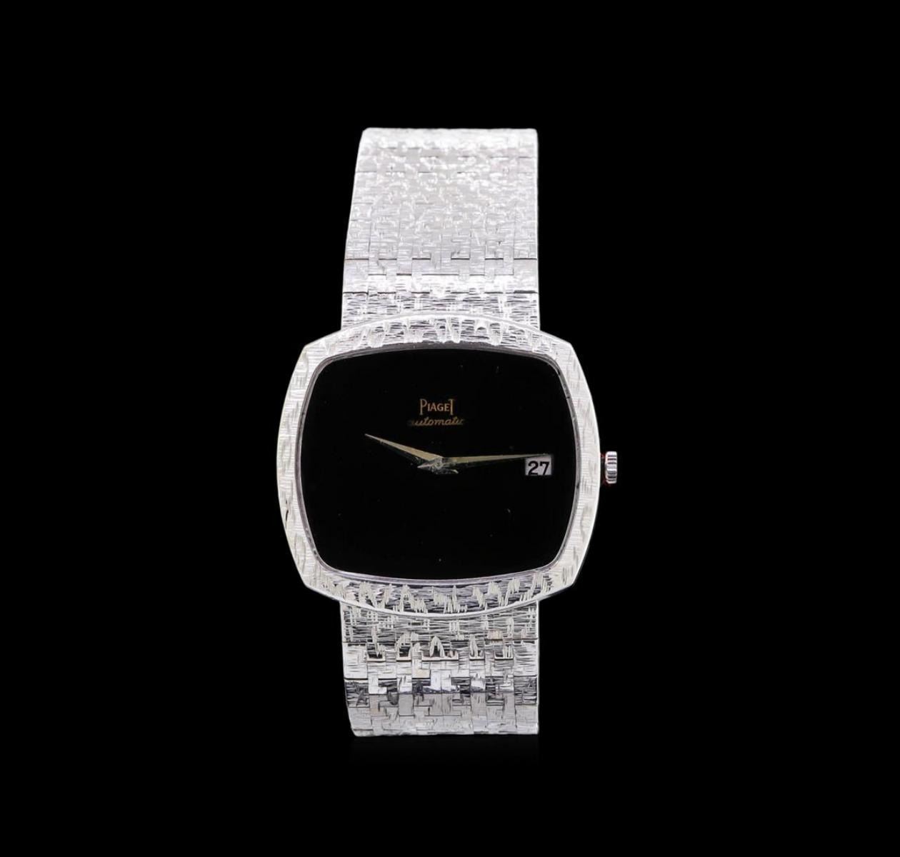 One Piaget automatic watch featuring: Case: 18KT white gold. Dial: Black color; silver tone hour and minute hands. Functions: Date window located at the 3 o'clock position. Bracelet: 18KT white gold.