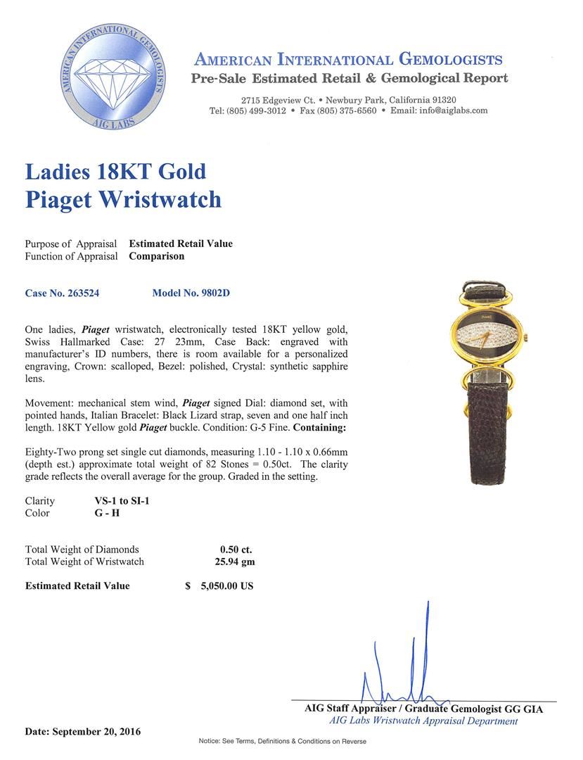 One ladies, Piaget wristwatch, electronically tested 18KT yellow gold, Swiss Hallmarked Case: 27 23mm, Case Back: engraved with manufacturer's ID numbers, there is room available for a personalized engraving, Crown: scalloped, Bezel: polished, Crystal: synthetic sapphire lens. Movement: mechanical stem wind, Piaget signed Dial: diamond set, with pointed hands, Italian Bracelet: Black Lizard strap, seven and one half inch length. 18KT Yellow gold Piaget buckle. Condition: G-5 Fine. Containing: Eighty-Two prong set single cut diamonds, measuring 1.10 - 1.10 x 0.66mm (depth est.) approximate total weight of 82 Stones = 0.50ct. The clarity grade reflects the overall average for the group. Graded in the setting. Clarity: VS-1 to SI-1 Color G - H. Total Weight of Diamonds 0.50ct. Total Weight of Wristwatch 25.94gm. AIG Appraised at $5,050.00.