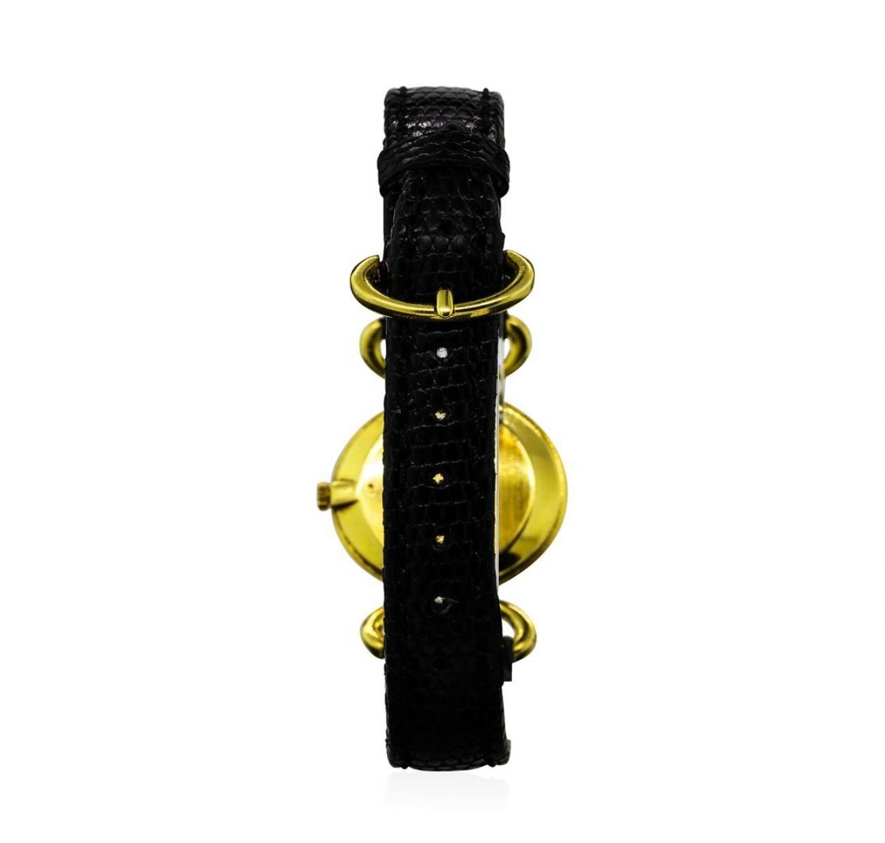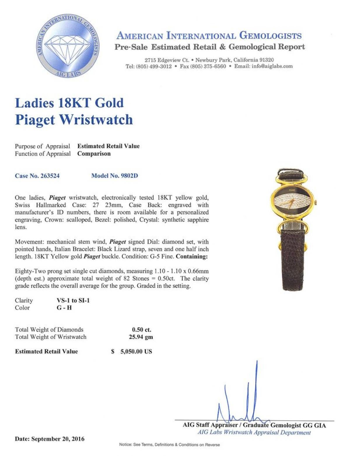 One ladies, Piaget wristwatch, electronically tested 18KT yellow gold, Swiss Hallmarked Case: 27 23mm, Case Back: engraved with manufacturer's ID numbers, there is room available for a personalized engraving, Crown: scalloped, Bezel: polished, Crystal: synthetic sapphire lens. Movement: mechanical stem wind, Piaget signed Dial: diamond set, with pointed hands, Italian Bracelet: Black Lizard strap, seven and one half inch length. 18KT Yellow gold Piaget buckle. Condition: G-5 Fine. Containing: Eighty-Two prong set single cut diamonds, measuring 1.10 - 1.10 x 0.66mm (depth est.) approximate total weight of 82 Stones = 0.50ct. The clarity grade reflects the overall average for the group. Graded in the setting. Clarity: VS-1 to SI-1 Color G - H. Total Weight of Diamonds 0.50ct. Total Weight of Wristwatch 25.94gm. AIG Appraised.