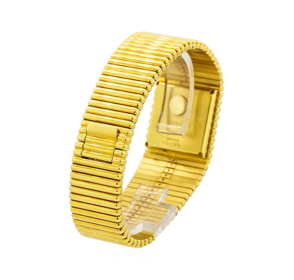 One, 18KT yellow gold Piaget Emperador wristwatch electronically tested, Case: 23 x 23mm, Swiss Hallmarked Case Back: secured by four set screws, engraved with the manufacturers logo, and ID numbers, Case Back Crown: scalloped, Bezel: pattern continuation, Crystal: synthetic sapphire. Movement: quartz, Piaget signed Dial: a field of Lapis Lazuli frames a central section of pave set diamonds below the pointed hands, Piaget Tapering Bracelet: bright finish Bullet link, Condition: G-6 Extra Fine. Seven inch length. Piaget signed overlocking clasp. Containing: Four bezel set round brilliant cut diamonds, measuring 1.50 - 1.40 x 0.87mm (depth est.) approximate total weight of 4 Stones = 0.05ct. Set & graded on the dial. Clarity: VVS-1 to VVS-2 Color E - G Forty-Nine prong set round brilliant cut diamonds, measuring 1.00 - 1.00 x 0.60mm (depth est.) approximate total weight of 49 Stones = 0.19ct. Set and graded on the dial. Clarity: VVS-1 to VS-1 Color F - H. Total Weight of Diamonds 0.24ct. Total Weight of Watch 152.07gm. AIG Appraised at $22,000.00.