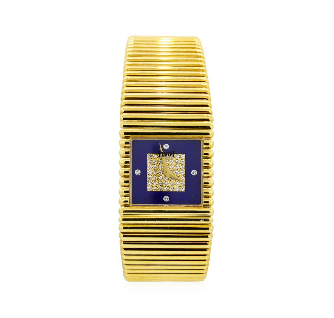 One, 18KT yellow gold Piaget Emperador wristwatch electronically tested, Case: 23 x 23mm, Swiss Hallmarked Case Back: secured by four set screws, engraved with the manufacturers logo, and ID numbers, Case Back Crown: scalloped, Bezel: pattern continuation, Crystal: synthetic sapphire. Movement: quartz, Piaget signed Dial: a field of Lapis Lazuli frames a central section of pave set diamonds below the pointed hands, Piaget Tapering Bracelet: bright finish Bullet link, Condition: G-6 Extra Fine. Seven inch length. Piaget signed overlocking clasp. Containing: Four bezel set round brilliant cut diamonds, measuring 1.50 - 1.40 x 0.87mm (depth est.) approximate total weight of 4 Stones = 0.05ct. Set & graded on the dial. Clarity: VVS-1 to VVS-2 Color E - G Forty-Nine prong set round brilliant cut diamonds, measuring 1.00 - 1.00 x 0.60mm (depth est.) approximate total weight of 49 Stones = 0.19ct. Set and graded on the dial. Clarity: VVS-1 to VS-1 Color F - H. Total Weight of Diamonds 0.24ct. Total Weight of Watch 152.07gm. AIG Appraised.