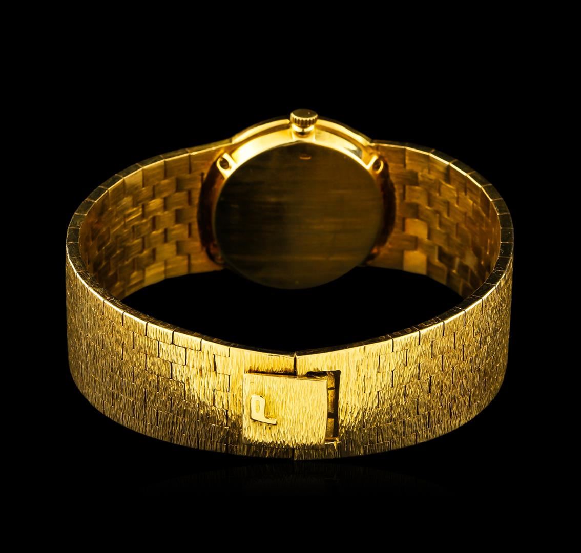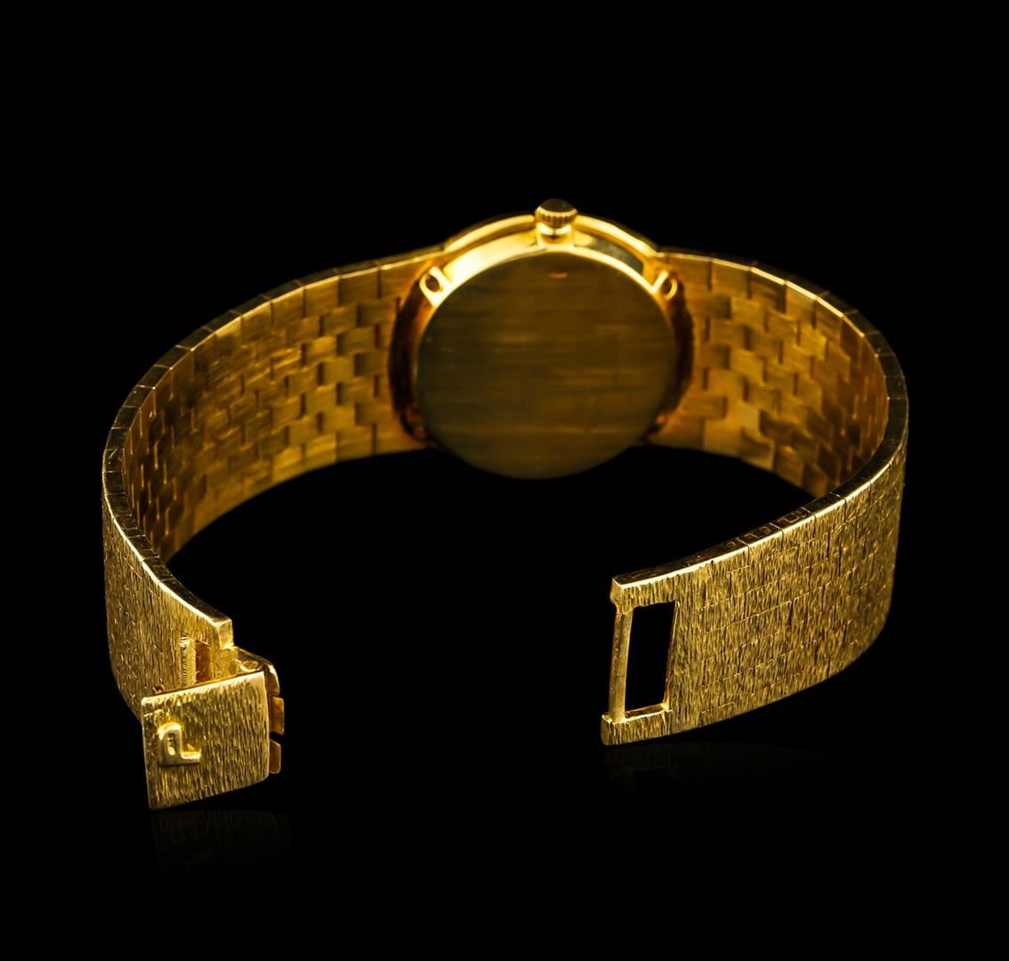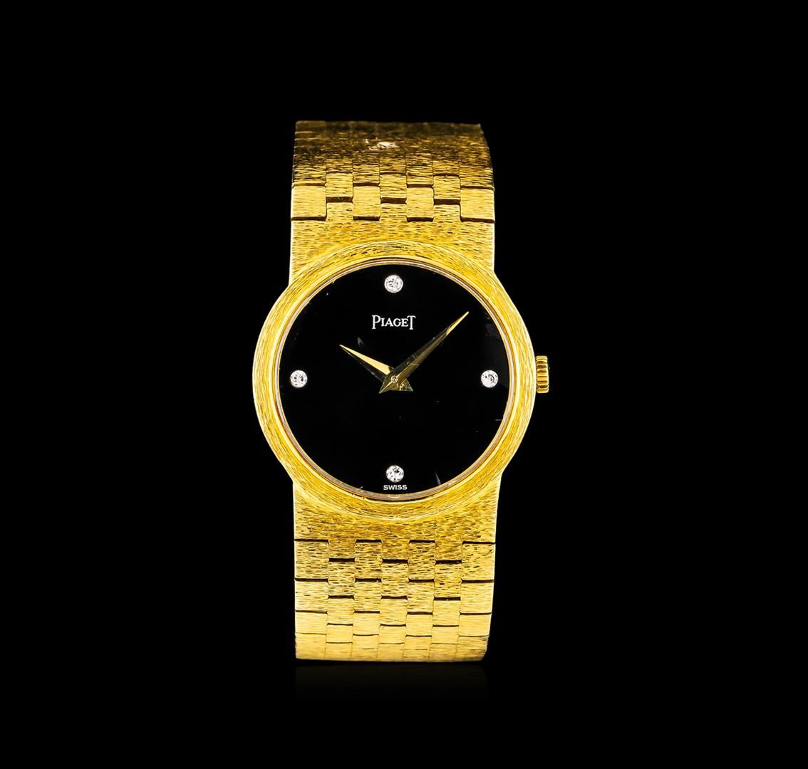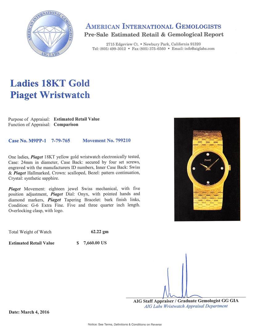 One ladies, Piaget 18KT yellow gold wristwatch electronically tested, Case: 24mm in diameter, Case Back: secured by four set screws, engraved with the manufacturers ID numbers, Inner Case Back: Swiss & Piaget Hallmarked, Crown: scalloped, Bezel: pattern continuation, Crystal: synthetic sapphire. Piaget Movement: eighteen jewel Swiss mechanical, with five position adjustment, Piaget Dial: Onyx, with pointed hands and diamond markers, Piaget Tapering Bracelet: bark finish links, Condition: G-6 Extra Fine. Five and three quarter inch length. Overlocking clasp, with logo. Total Weight of Watch 62.22gm. AIG Appraised at $7,660.00.