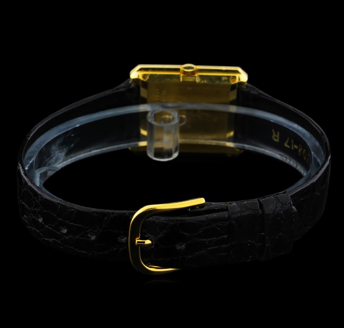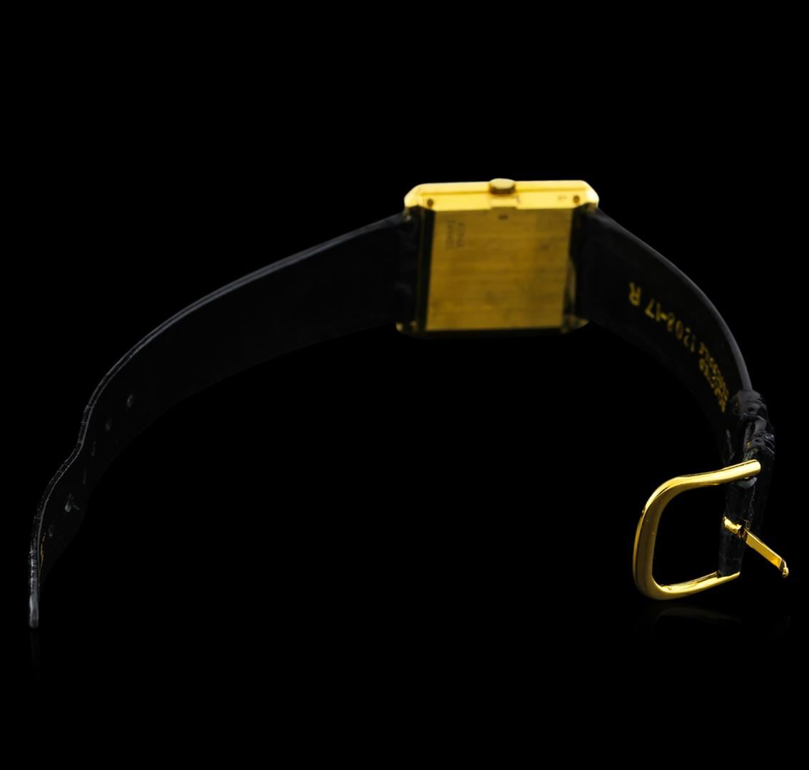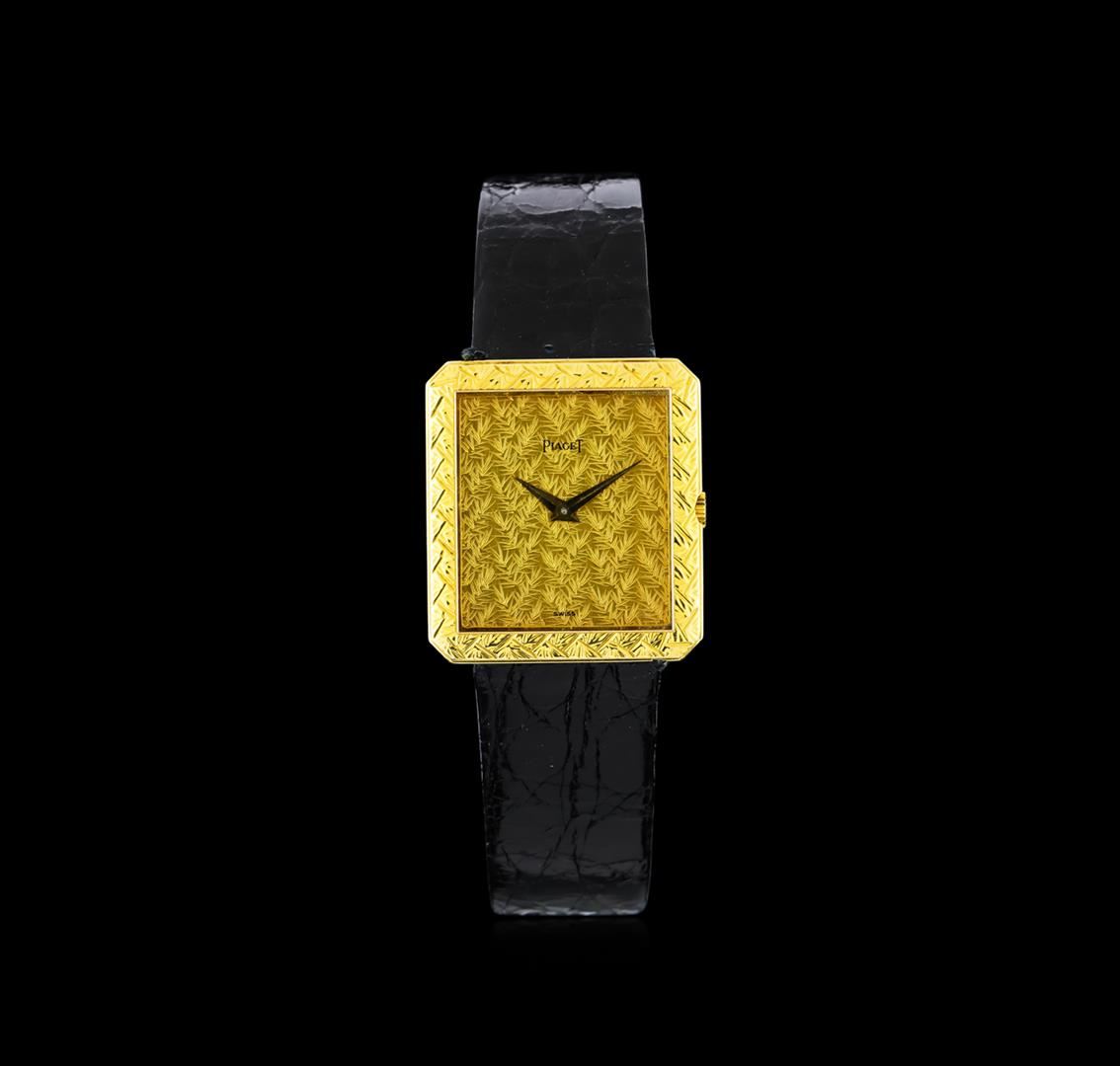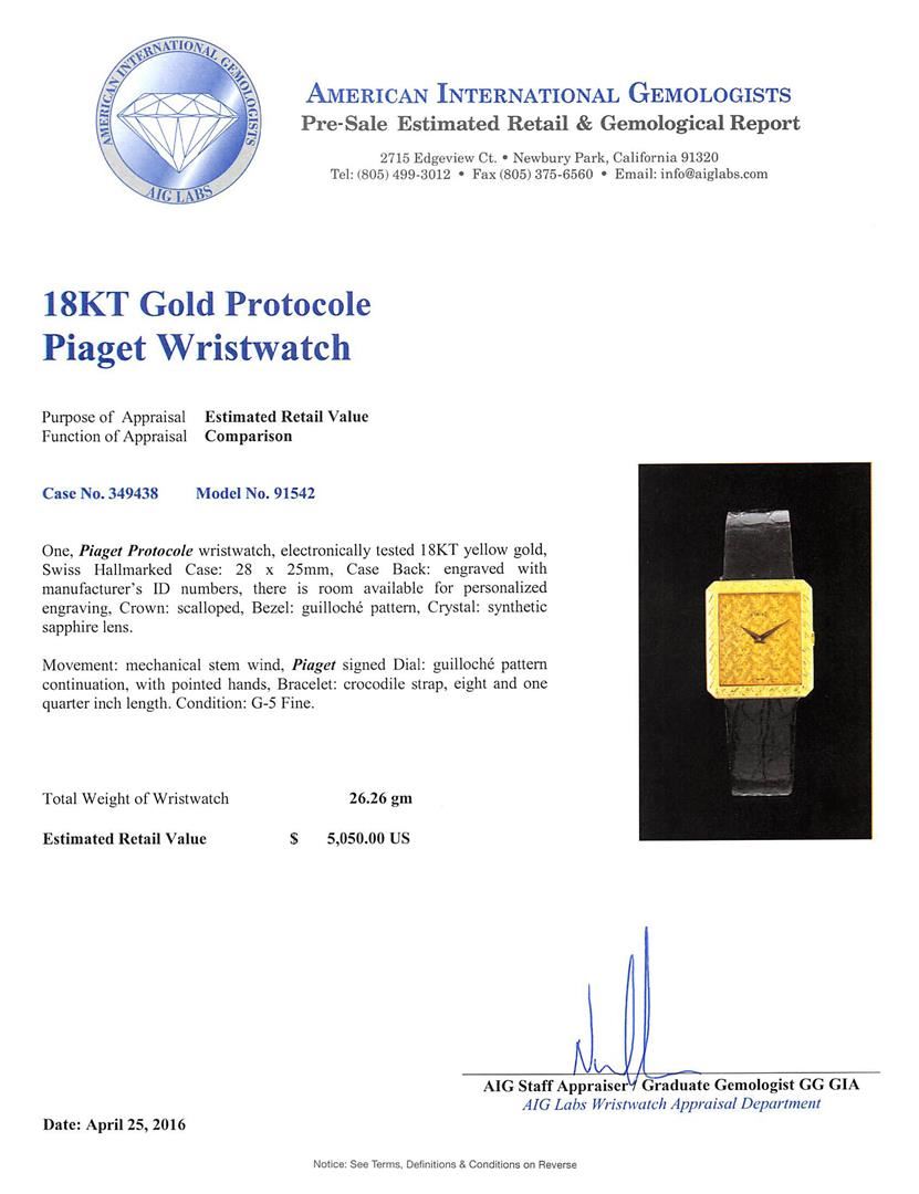 One, Piaget Protocole wristwatch, electronically tested 18KT yellow gold, Swiss Hallmarked Case: 28 x 25mm, Case Back: engraved with manufacturer's ID numbers, there is room available for personalized engraving, Crown: scalloped, Bezel: guilloche, pattern, Crystal: synthetic sapphire lens. Movement: mechanical stem wind, Piaget signed Dial: guilloche, pattern continuation, with pointed hands, Bracelet: crocodile strap, eight and one quarter inch length. Condition: G-5 Fine. Total Weight of Wristwatch 26.26gm. AIG Appraised at $5,050.00.