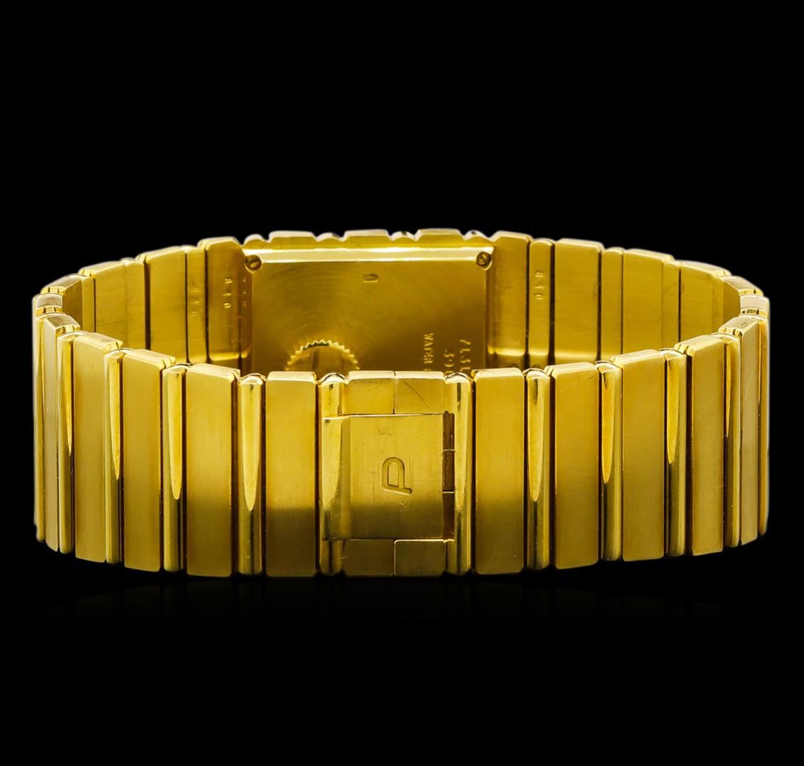 One Piaget watch featuring: Case: 18KT yellow gold. Dial: Gold color; gold tone hour and minute hands. Bracelet: 18KT yellow gold. Comes with extra links.