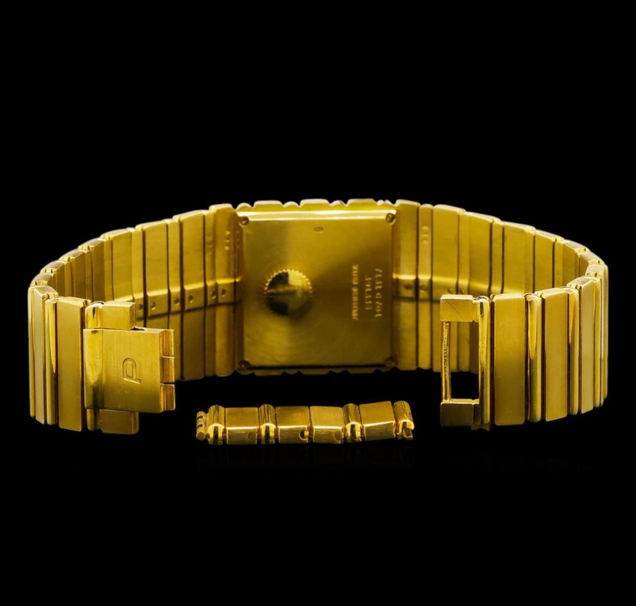 One Piaget watch featuring: Case: 18KT yellow gold. Dial: Gold color; gold tone hour and minute hands. Bracelet: 18KT yellow gold. Comes with extra links.