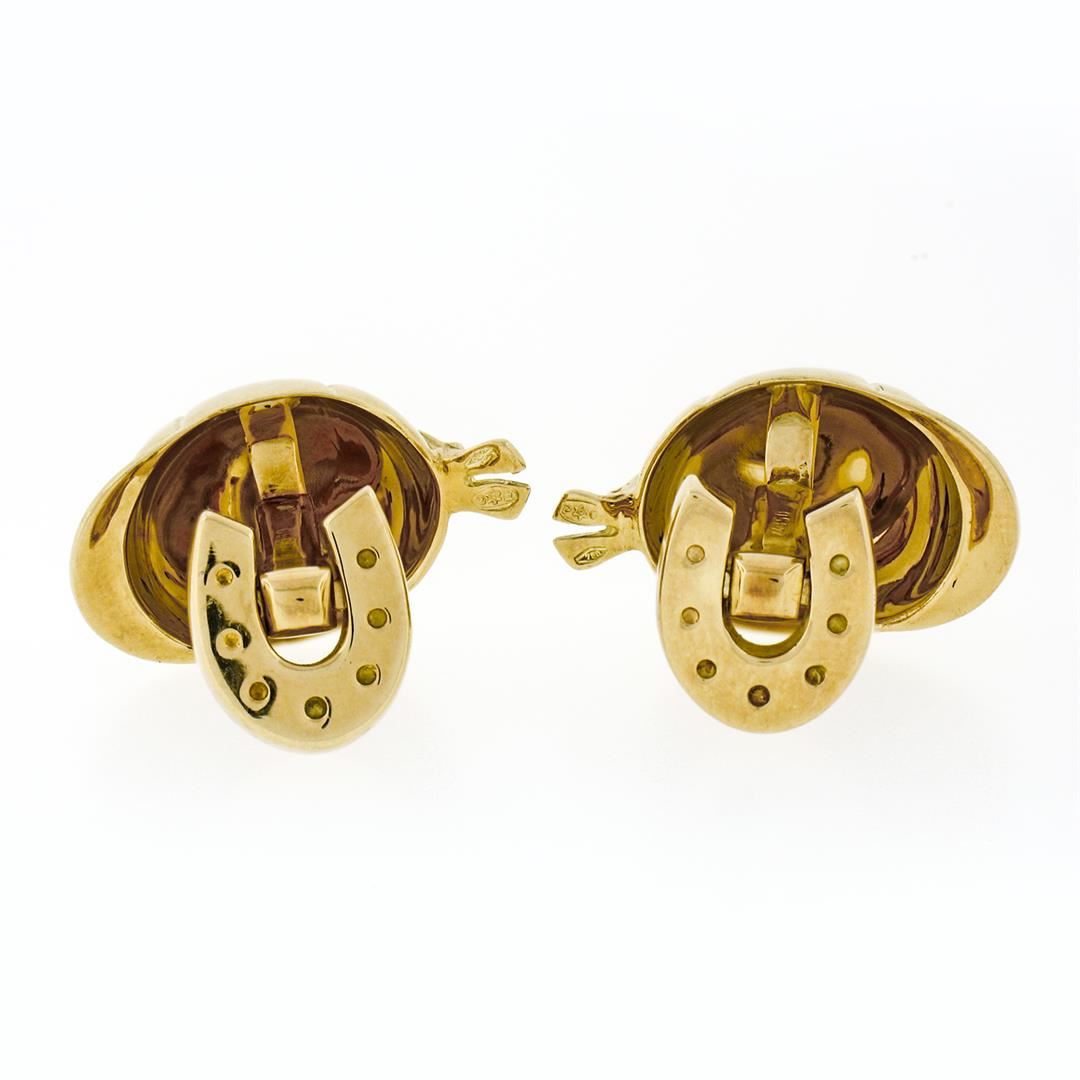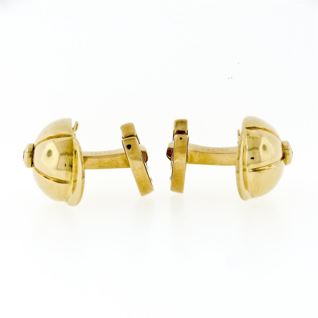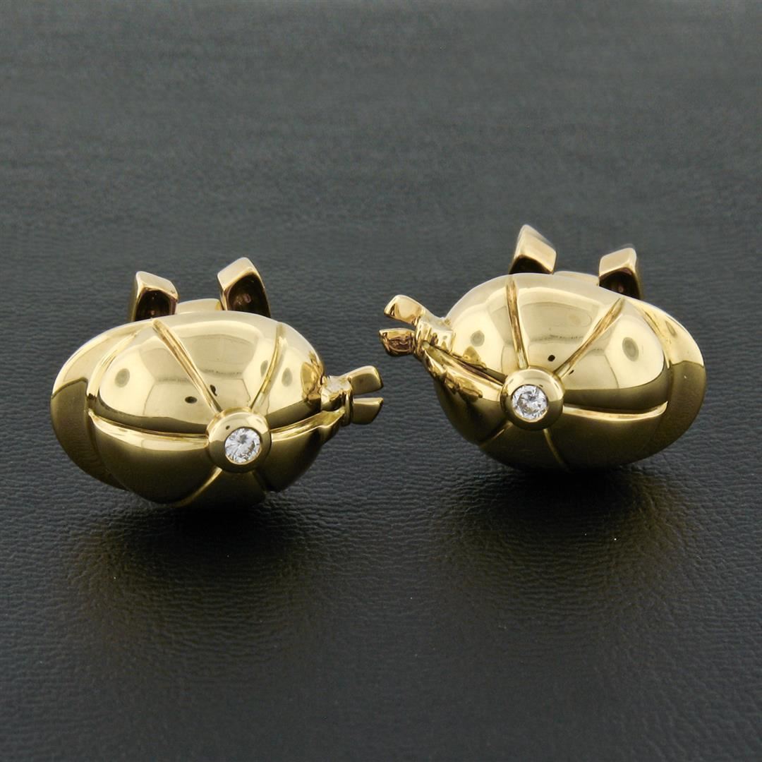 An estate solid 18k yellow gold cufflinks by Piaget, with 2 round brilliant cut natural diamonds (F - VVS2 ; 0.10ctw). These cuff links have a swivel design with a clearance of 9.30mm, weigh a total of 16.21 grams, and the front panels measure 13.82x22.68mm.