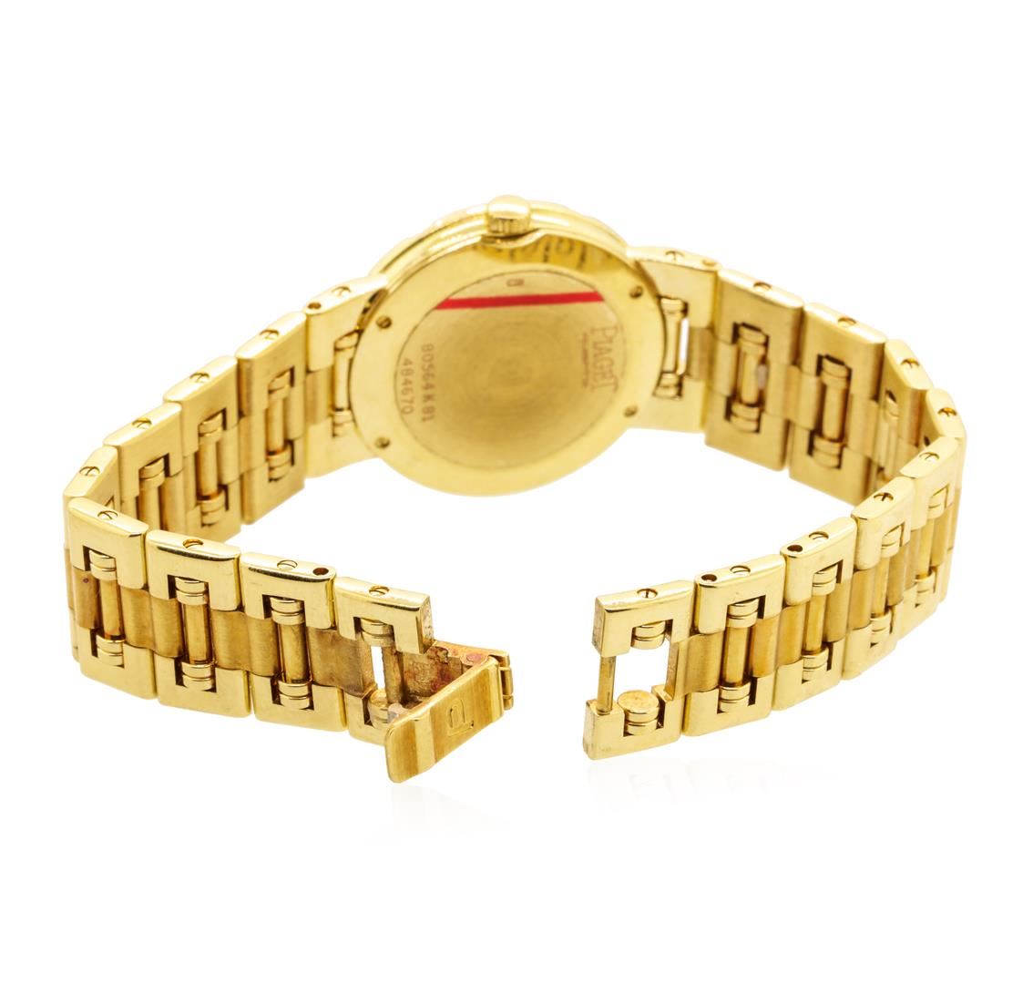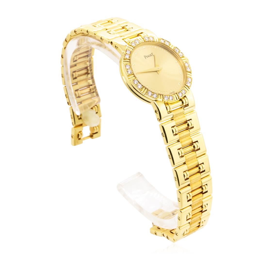 One lady's Piaget Dancer 18KT yellow gold wristwatch with an attached 18KT yellow gold bracelet. Serial #:80564K81, Model #: 484670. Crown: fluted, pull-out. Bezel: diamond set 18KT yellow gold. Crystal: synthetic sapphire. Movement: quartz. Dial: gold with dot marker numerals and baton, pointed-type hands. Bracelet: matching 18KT yellow gold. Case: 23mm. The watch has a total weight of 58.2 grams.