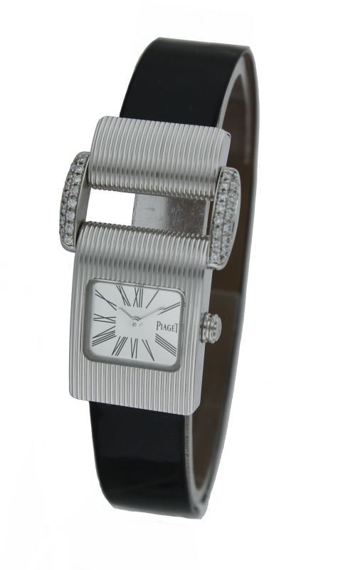Model: GOA34046 - CASE = [Material:18k White Gold], [Case Diameter:39], [Case Back:Solid], [Water Resistant:30 Meters /100 feet], [Crystal:Scratch Resistant Sapphire], DIAL = [Color:Silver], MOVEMENT = [Type:Qaurtz], BAND = [Clasp:Deployment], [Type:Black Leather with upper-side lugs paved with alluring diamonds], (Usually ships in 2 to 4 weeks.)