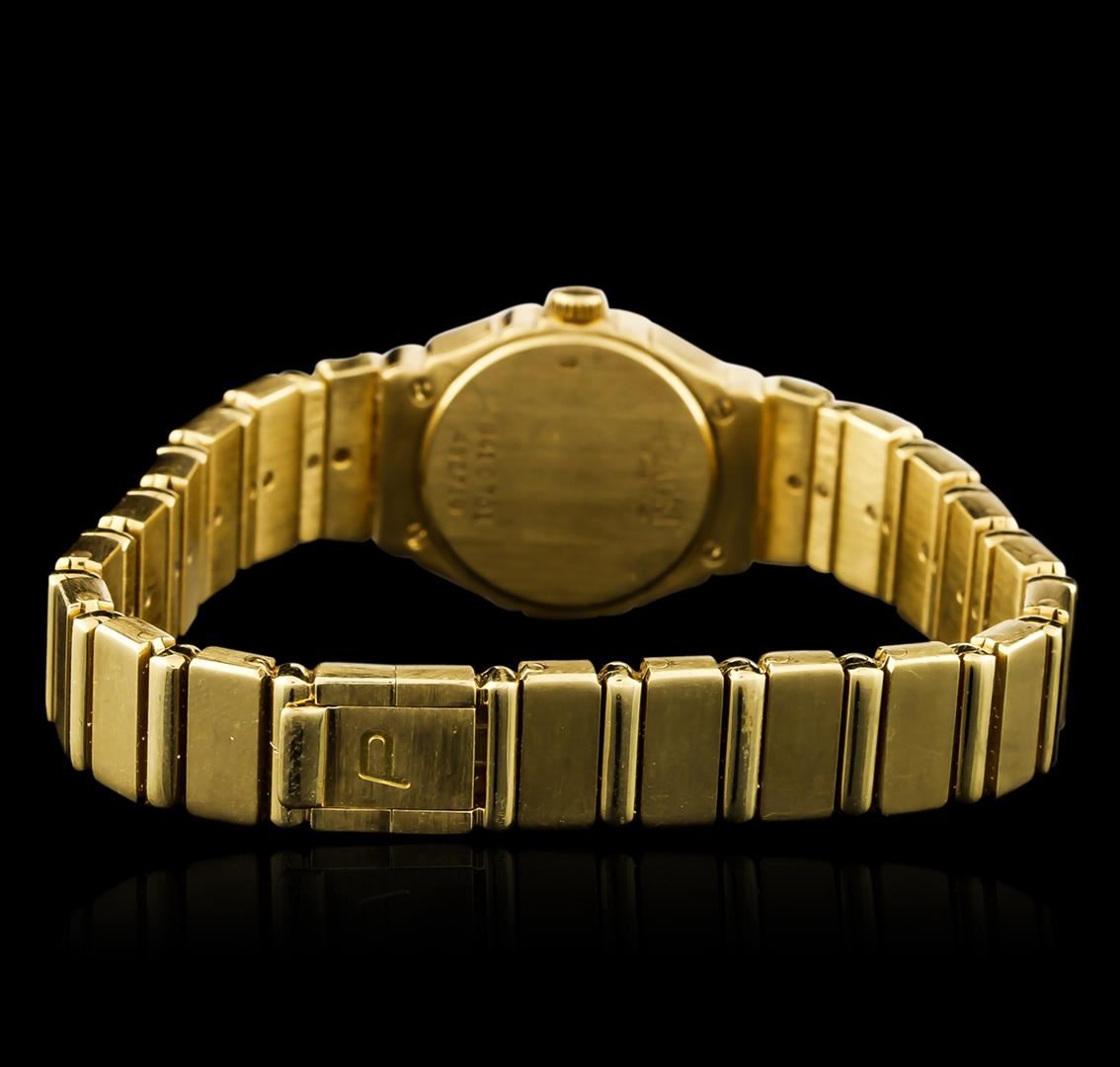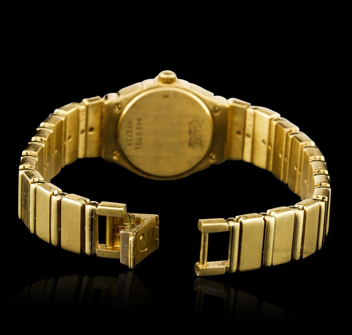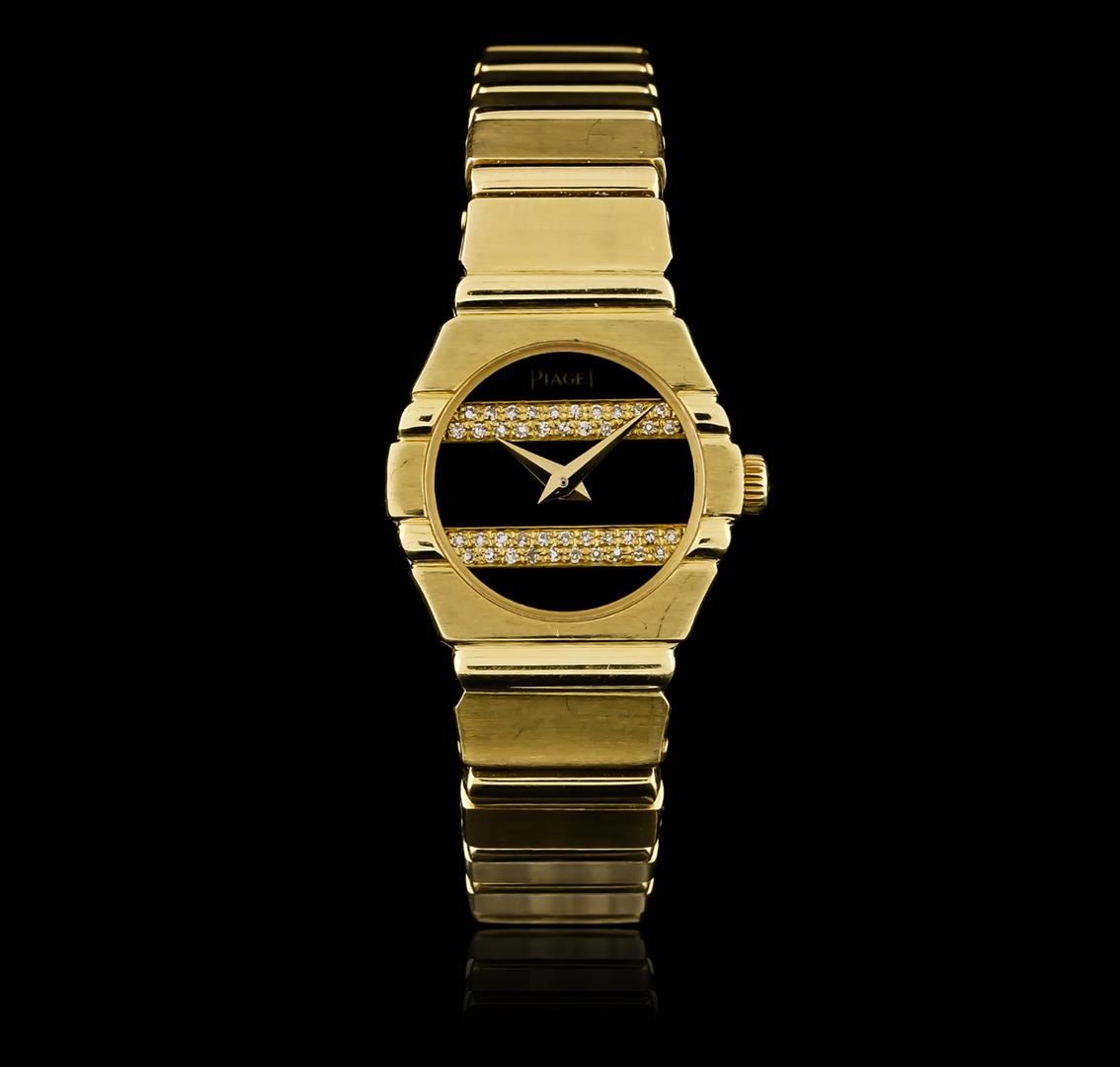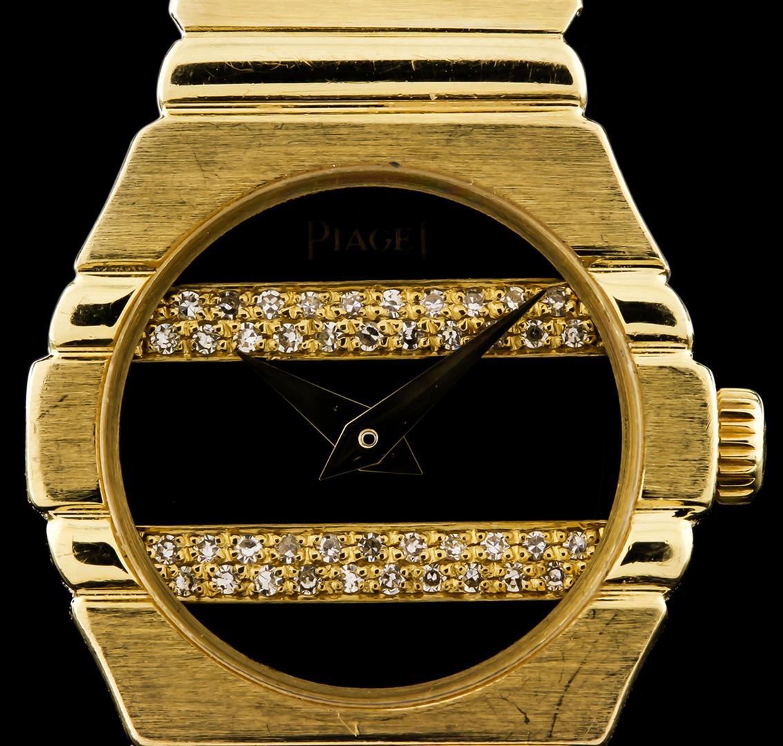 One ladies, Piaget Polo 18KT yellow gold wristwatch electronically tested, Case: 19mm diameter, logo'd Crown, Bezel: pattern continuation, Crystal: synthetic sapphire. Movement: Swiss quartz, Black Dial: pattern continuation with two rows of diamonds, pointed hands, Integrated bracelet: Piaget Polo, Condition: G-5 fine. Six and one quarter inch length. Fold over snap locking clasp, with logo. Total Weight of Watch 170.10 grams. AIG appraised at $14,000.00. AIG Appraised at $14,000.00.
