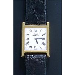 Piaget, a lady's 18ct gold square wristwatch, circa 1990, Ref.339814 70802, the white dial with Roman numerals and blued steel hands, the square two piece screwed case with back set, on a black leather strap, Piaget quartz movement