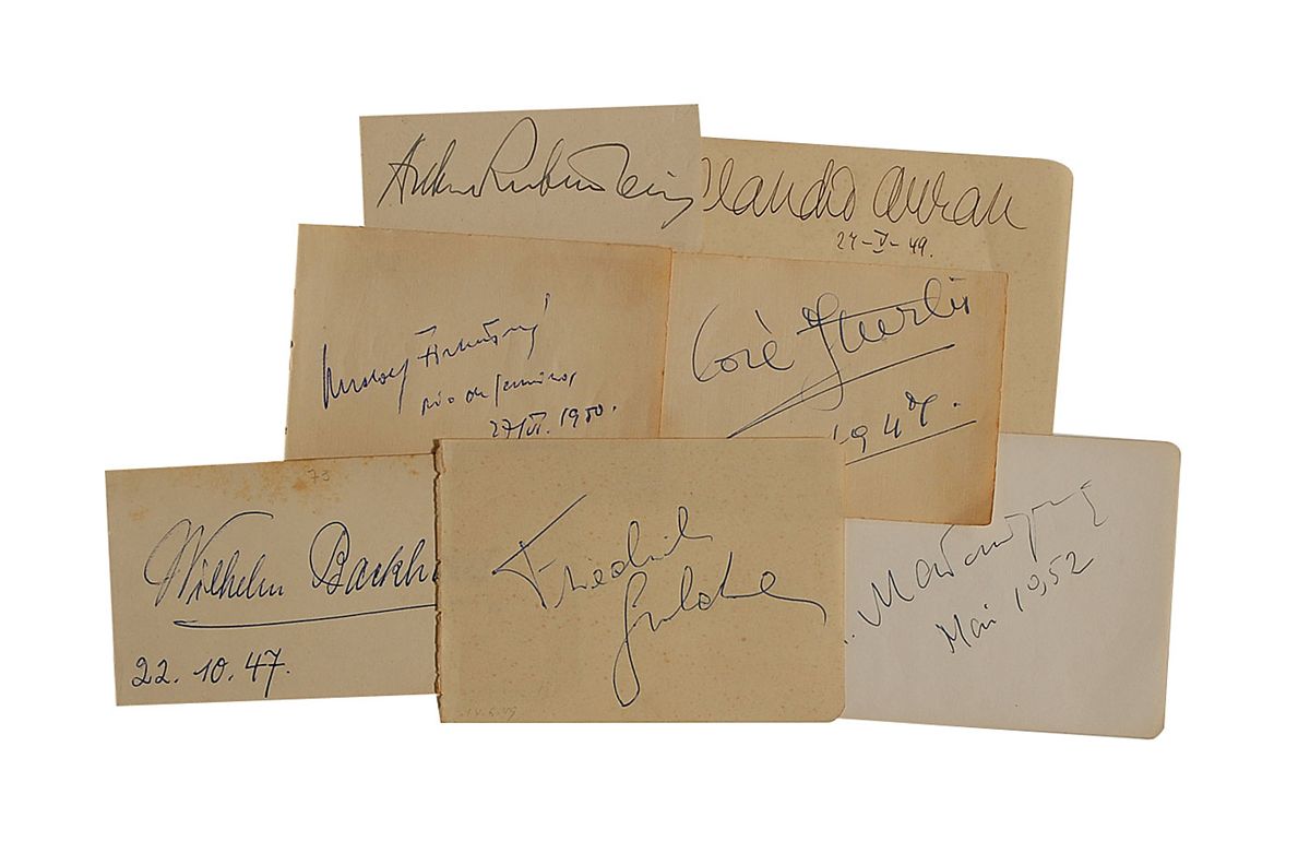 Vintage ink signatures of Claudio Arrau, Wilhelm Backhaus, Rudolf Firkusny, Friedrich Gulda, Jose Iturbi, Witold Malcuzynski, and Arthur Rubinstein on individual off-white slips, album pages, and cards. In very good overall condition.