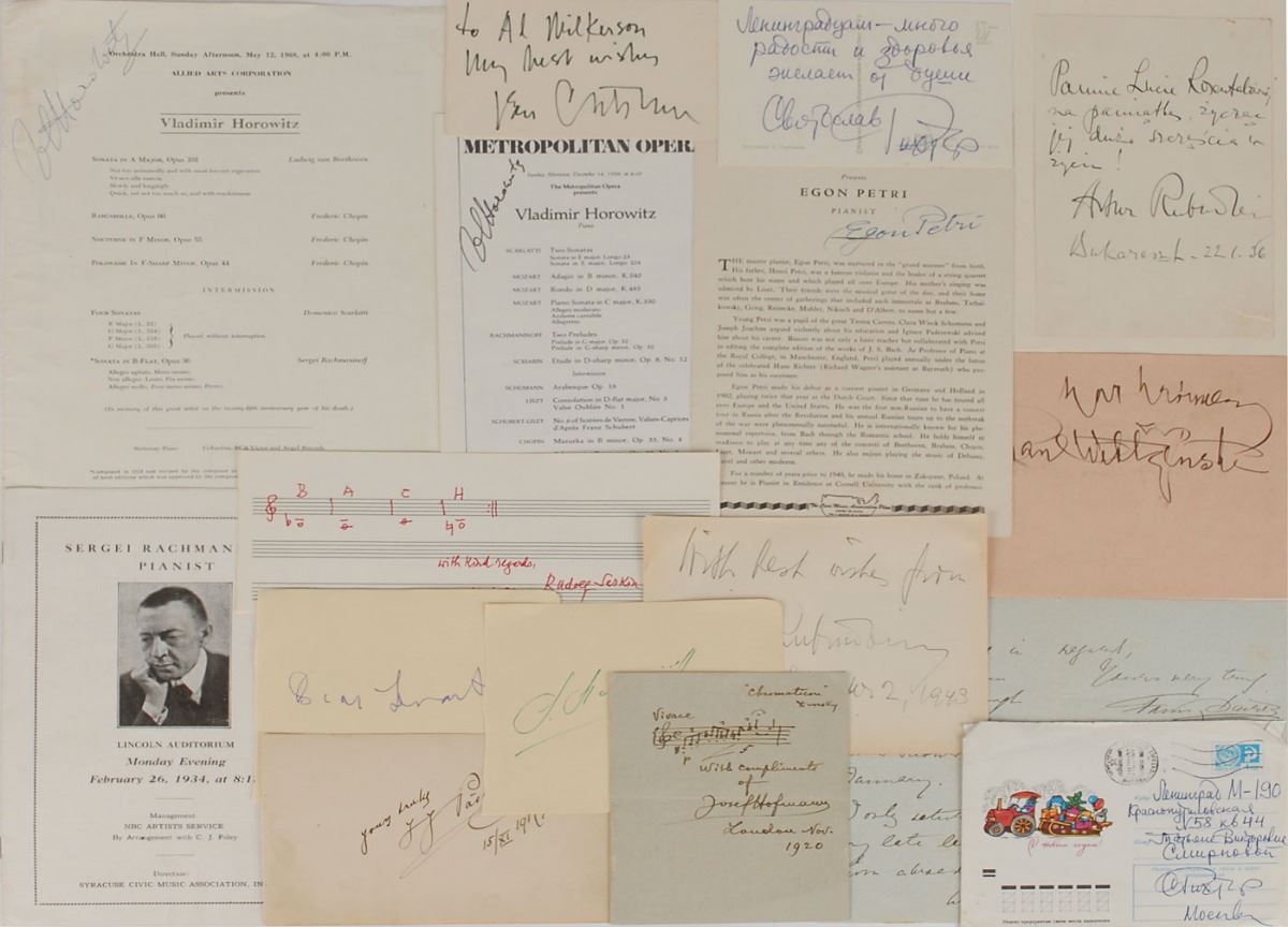 Collection of more than 125 items signed by pianists, consisting of a variety of signatures, letters, programs, AMQSs, and photos, with some of the most notable signers including: Van Cliburn, Fanny Davies, Josef Hoffmann, Vladimir Horowitz, Oscar Levant, Ignacy Paderewski, Egon Petri, Sergei Rachmaninoff, Sviatoslav Richter, Arthur Rubinstein, Rudolf Serkin, and Paul Wittgenstein. In overall very good to fine condition.