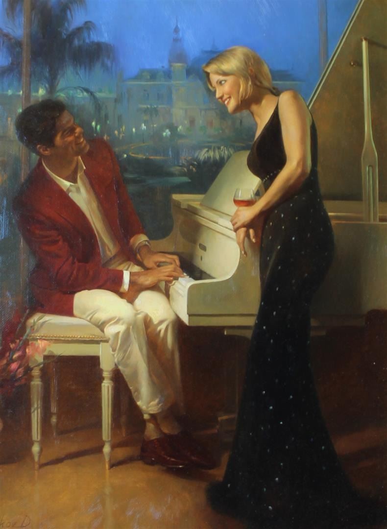 Russian artist, Dmitriy Volkov, depicts a pretty young woman holding a glass of wine and dressed in formal attire, standing next to a baby grand piano as she enjoys a conversation with the handsome pianist. The oil on canvas measures 24 x 18; framed image