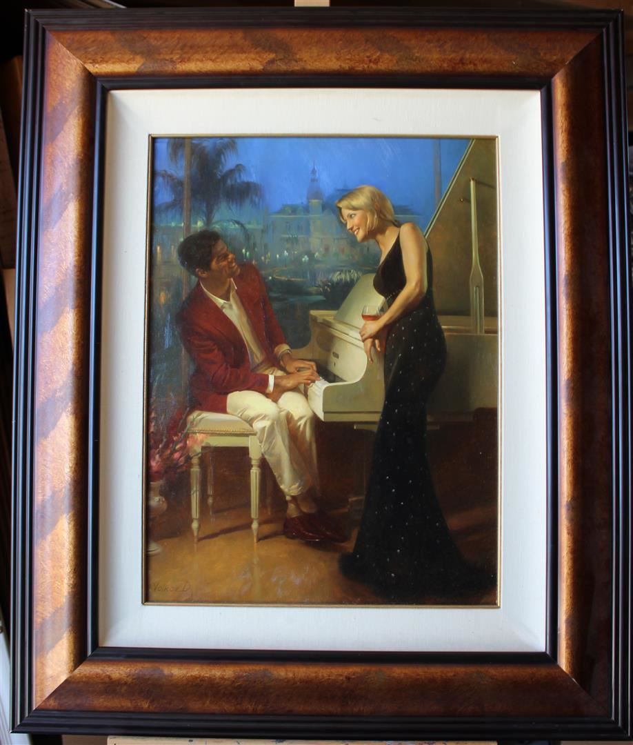 Russian artist, Dmitriy Volkov, depicts a pretty young woman holding a glass of wine and dressed in formal attire, standing next to a baby grand piano as she enjoys a conversation with the handsome pianist. The oil on canvas measures 24 x 18; framed image measures approx. 36 x 30.